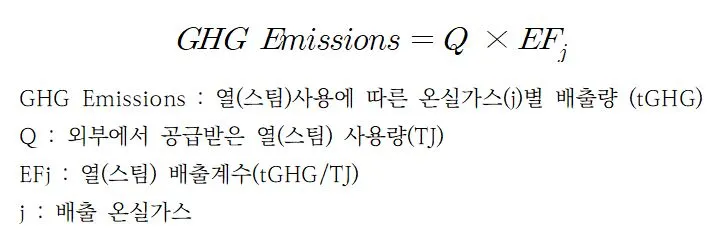 외부에서 공급된 스팀 사용에 따른 간접배출량은 아래의 식으로 산정됩니다. 이 역시 가정이나 기업에서 사용한 스팀의 소비량(TJ)에 스팀 배출계수(tGHG/TJ)를 곱하여 산정합니다. 그리고 스팀 사용에 따른 온실가스로는 이산화탄소, 메탄 및 아산화질소가 나옵니다. 아래의 식에서도 j가 바로 이산화탄소, 메탄 및 아산화질소를 의미합니다.