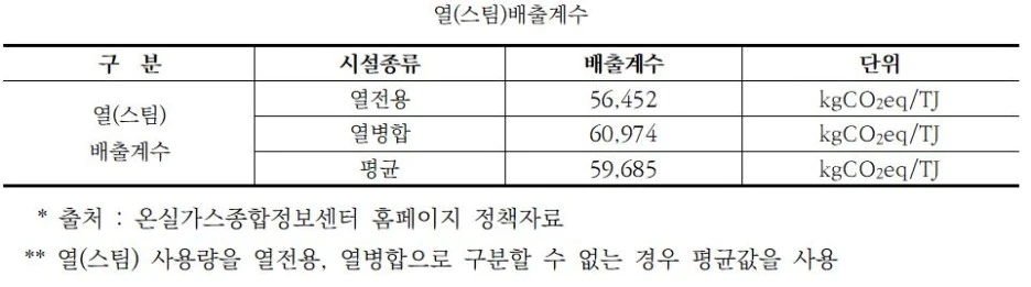 반면 스팀은 가정이나 산업단지 인근의 열병합 발전소로부터 생산됩니다. 그렇기에 자신이 스팀을 공급받는 열병합 발전소의 에너지 효율과 에너지원의 종류에 따라 다른 스팀 배출계수가 존재합니다.