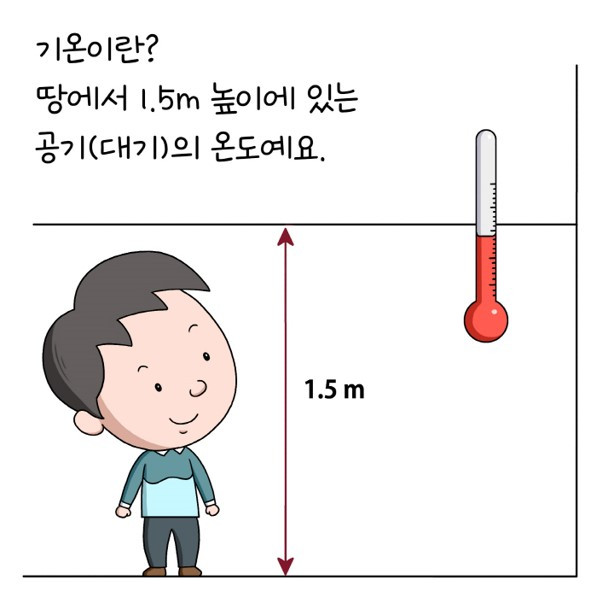 먼저 평균기온입니다. 기온은 ‘대기 온도’를 줄인 말입니다. 그런데 특정 장소에서 기온을 잴 때도 하늘에 장비를 띄워 잴 수도 있고, 땅바닥 높이에서도 온도를 잴 수도 있을 것입니다. 우리나라에서는 지상 1.5m 높이에서 기온을 측정합니다. 하필 높이가 1.5m인 이유는 이 정도의 높이가 우리가 숨을 쉬면서 생활하는 높이이기 때문입니다.