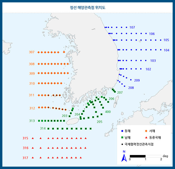 기상청에서 기상관측소를 통해 기온, 습도, 풍속 등을 측정하는 것과 마찬가지로, 국립수산과학원에서도 우리나라 삼면의 바다에 200개 정도의 해양관측점에서 수온, 염분, pH 등을 측정하고 있습니다.