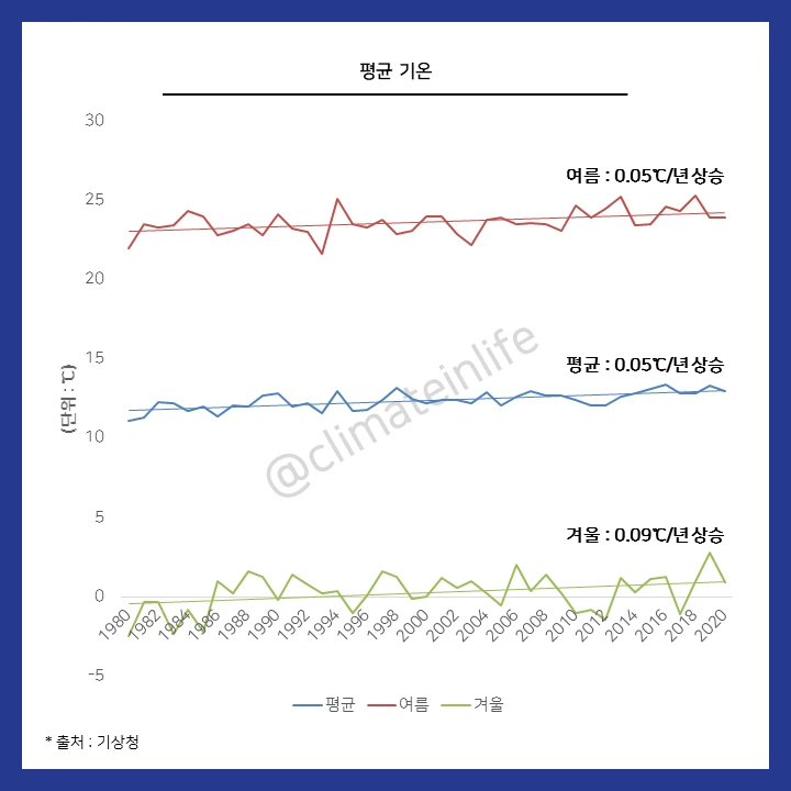 1980년 우리나라의 평균기온은 11.1℃이며, 여름철은 22.0℃, 겨울철은 –2.5℃ 정도였습니다. 여름철에는 30℃가 넘고 겨울철에는 영하 10℃가 넘을지라도 1년 365일 평균값을 만들면 11.1℃ 정도 되었다는 의미입니다.