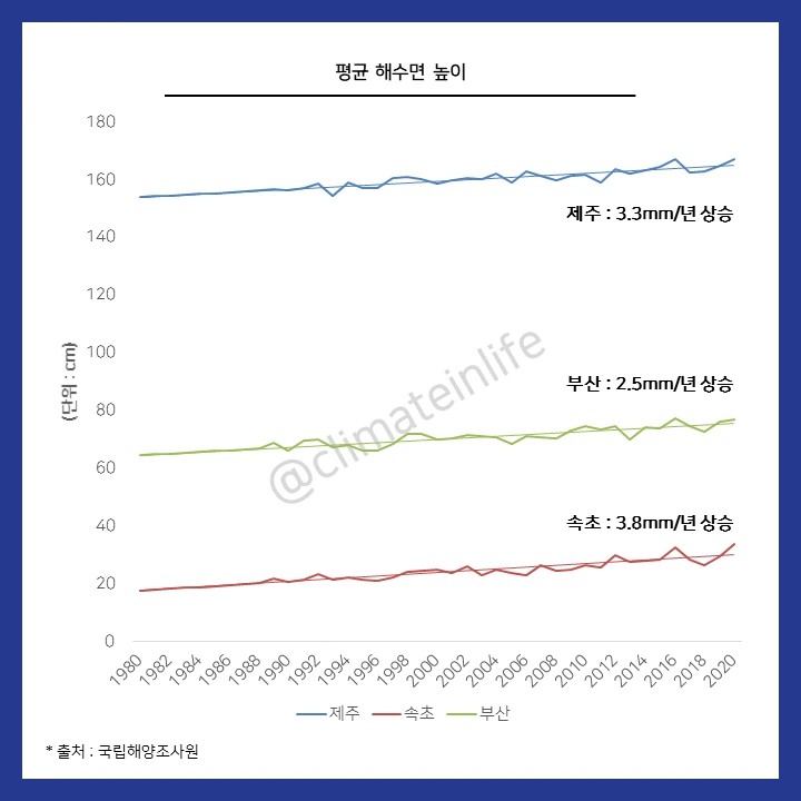 31년 사이에 세 지역의 평균 해수면 높이는 8.1~12.0cm 정도 상승했습니다. 연평균으로 계산하면 제주가 3.3mm/년, 속초가 3.8mm/년, 그리고 부산이 2.5mm/년으로 세 지역에서는 속초의 해수면 높이 상승 속도가 가장 빨랐습니다.