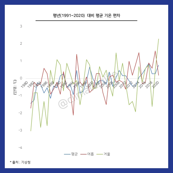 평년(1991~2020년)의 우리나라 평균기온은 12.5℃, 여름철은 23.7℃, 그리고 겨울철은 0.5℃였습니다. 그런데 자료를 보시다 보면 편차(偏差)라는 단어를 보실 것입니다. 편차는 “수치, 위치, 방향 등이 일정한 기준에서 벗어난 정도나 크기”를 의미합니다. 평균기온의 편차는 해당연도의 평균기온에서 평년(1991~2020)의 평균기온으로 빼주면 됩니다. 그렇게 되면 아래와 같은 그래프를 얻을 수 있습니다.