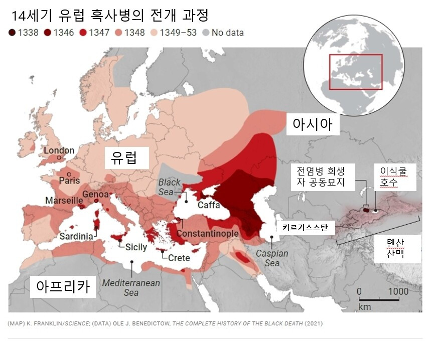 흑사병의 기원에 대해 최근 연구 결과에 따르면 흑사병은 유럽 유행 8년 전 중앙아시아의 키르기스스탄 북구 산악지대에서 발원하였다고 합니다. 그리고 유럽으로의 전파 경로에 대해서는 아직까지 논쟁이 있으나, 실크로드와 몽골 제국을 통해 유럽 서쪽 관문부터 점차 동쪽으로 전파된 것으로 밝혀졌습니다.