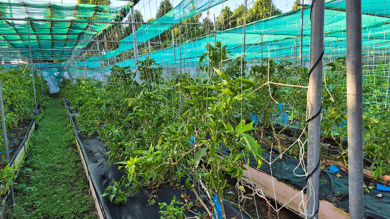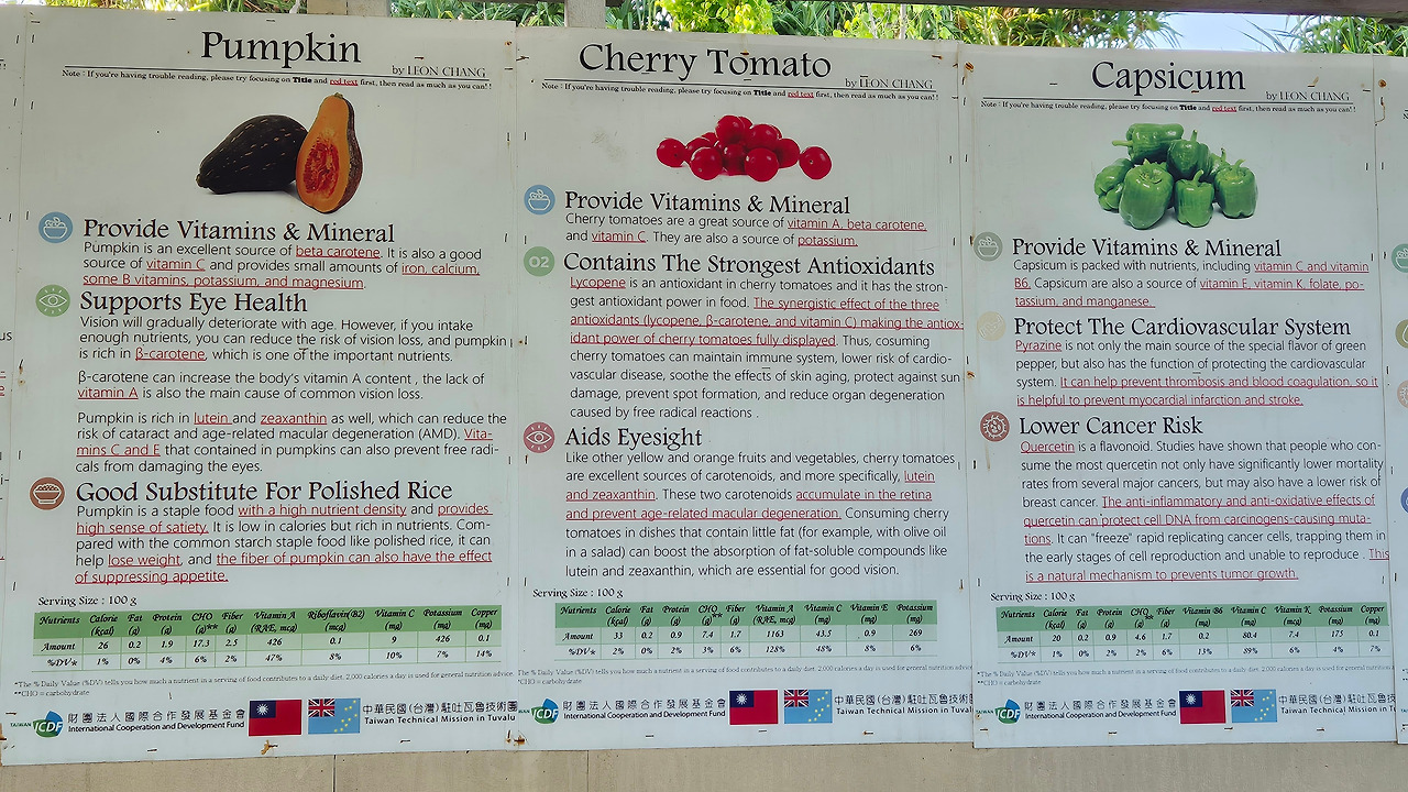 농장에서는 농작물을 위해 두 가지 조치를 한다. 첫 번째는 우리의 인삼밭과 같이 태양 빛의 일부를 차단하기 위해 햇빛 차단 지붕을 설치하는 것이다. 항공 지도를 보면 활주로 남쪽의 1/3 정도 되는 지점의 오른편에 녹색으로 된 인공구조물이 보인다. 거기가 농장이고, 녹색은 햇빛 차단막이다. 두 번째는 수정을 시켜줘야 한다. 투발루에는 나비만 있고, 벌은 없다고 한다. 그래서 모든 농작물을 인위적으로 사람이 수정을 시켜줘야 한다고 한다.