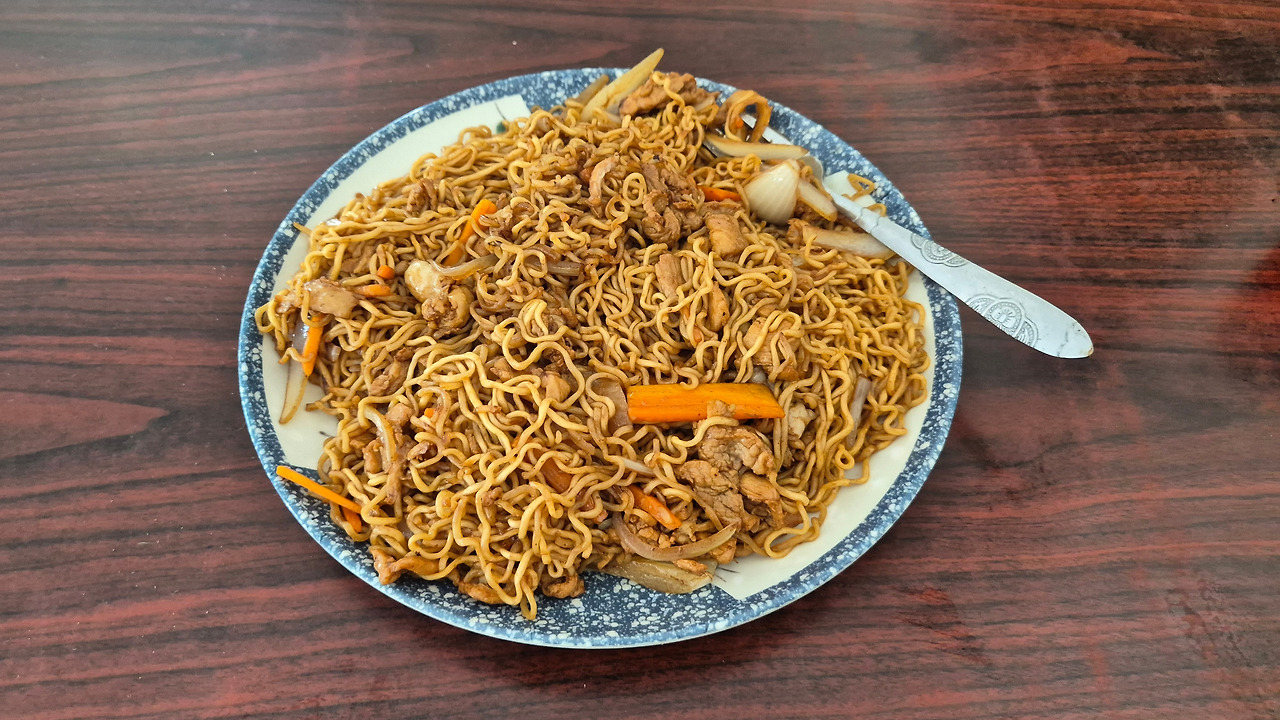 낭스는 특이하게 간판에 붉은 바탕에 노란색 굵은 글씨로 ‘패스트푸드’라고 써놨다. 그런 만큼 정말 빨리 요리가 나오기는 한다. 낭스에서는 치킨볶음면(fried chicken noodle)을 시켰는데, 거짓말이 아니고 내 얼굴보다 큰 접시에 간장 베이스로 요리한 볶은 면이 한가득 담겨 나왔다. 열심히 먹는다고 먹었는데도 반쯤은 남기고 나왔다. 투발루인들이 식사를 정말로 많이 하는구나 느끼게 된 계기였기도 하고, 투발루인들의 비만율이 높은 이유도 짐작 갔다.