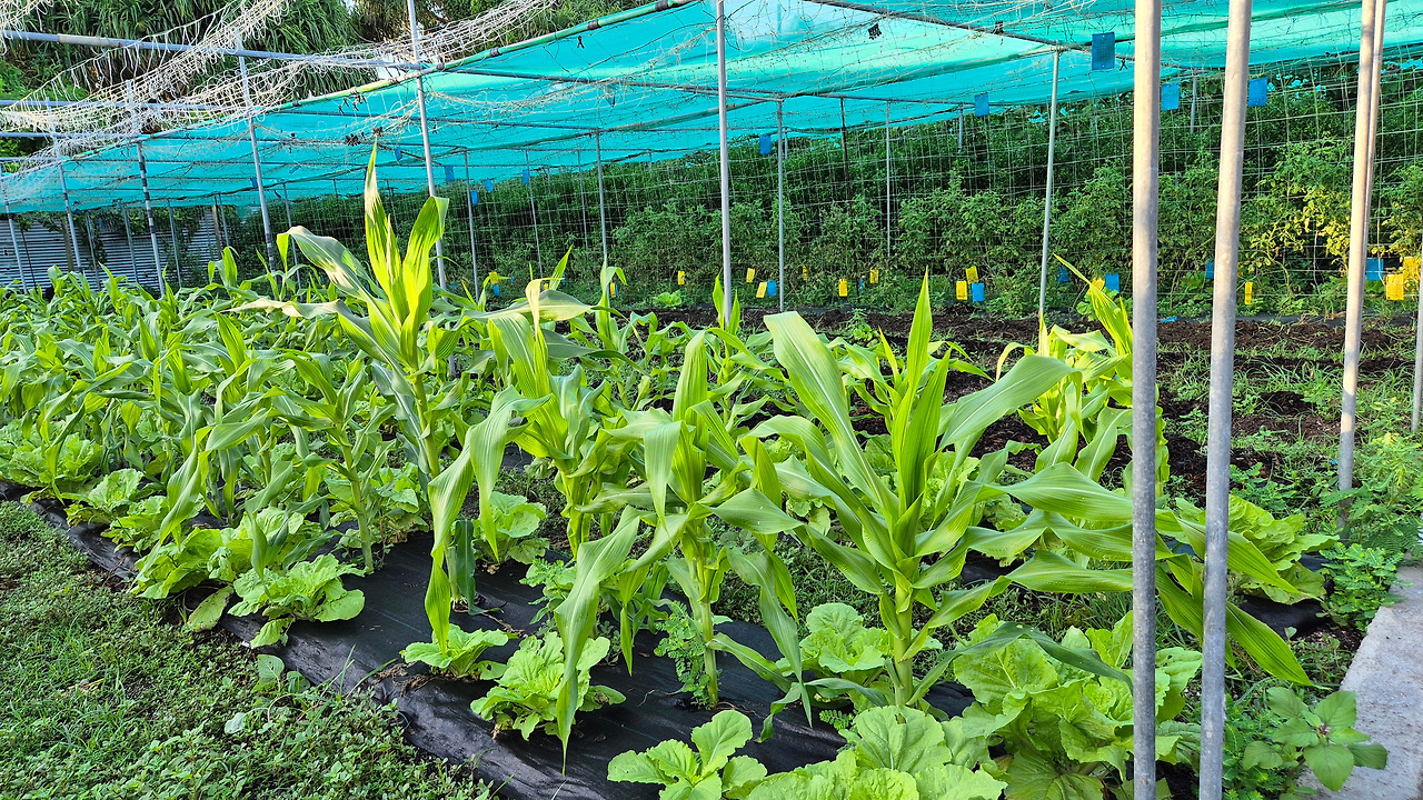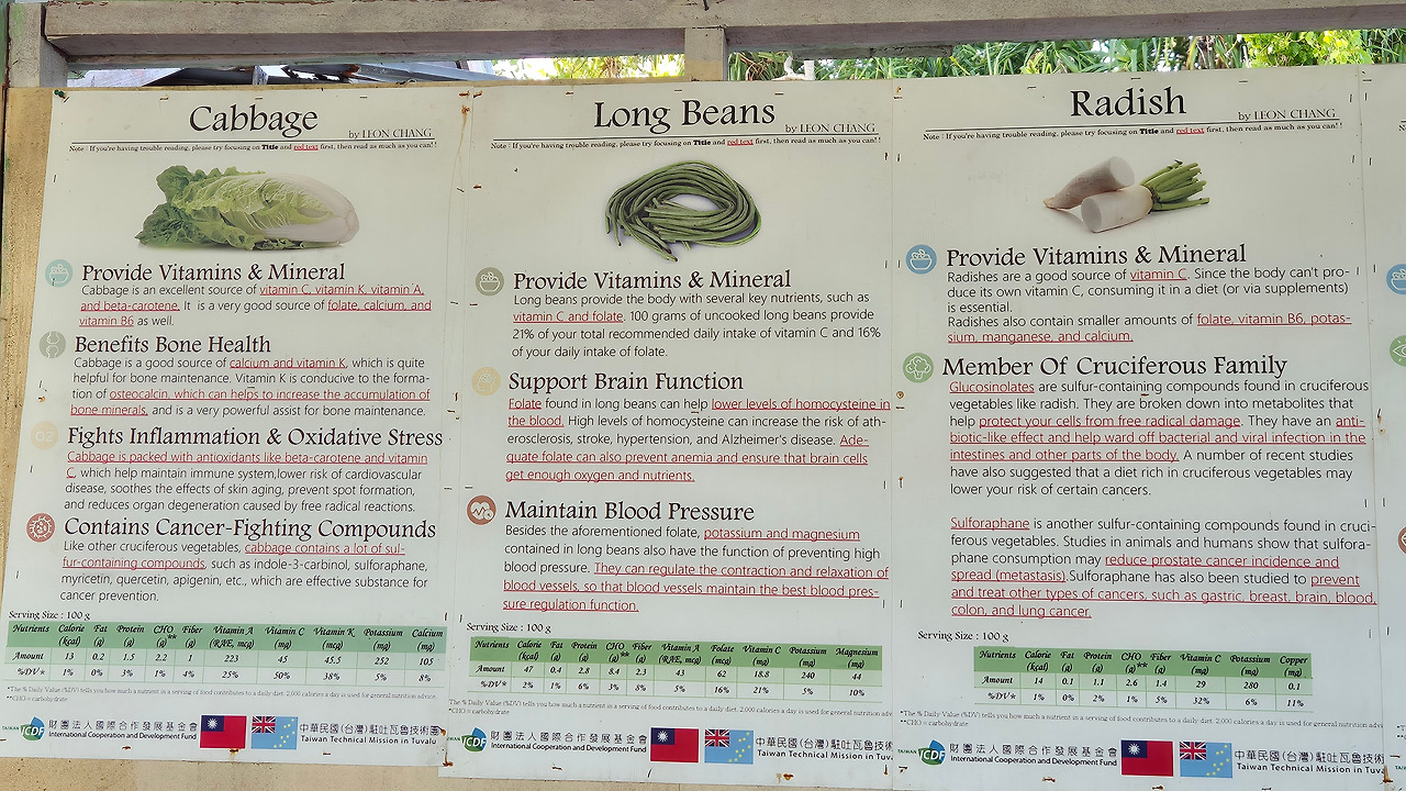 발효된 비료를 1년에 한 번씩 대만에서 화물로 운송해 온 흙과 섞어 농작물 심을 토양을 마련한다. 농장에는 무, 양배추, 오이, 오크라(okra), 콩, 토마토, 피망, 호박 등을 재배한다. 농장 벽에 붙은 설명자료에는 없는 농작물이지만, 농장을 돌아보면서 파, 고추, 옥수수도 볼 수 있었다.