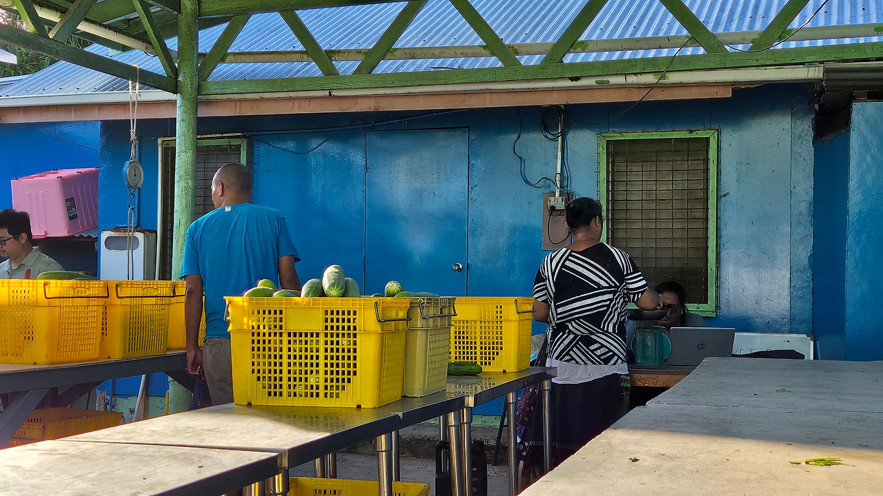 내가 들렸던 화요일에는 사람이 많지는 않았다. 이날은 오이와 호박을 주로 팔고 있었다. 투발루 주민들이 익숙한 듯 오토바이를 문 앞에 주차하고 성큼성큼 들어온다. 어느 나라의 주부가 그러하듯이 노란 상자에 담긴 오이와 호박을 들쳐 보면서 상처는 없는지, 잘 익었는지를 알아본다. 가족을 먹을 것이기에 이왕이면 품질이 좋은 것을 고르는 것일 터이다.