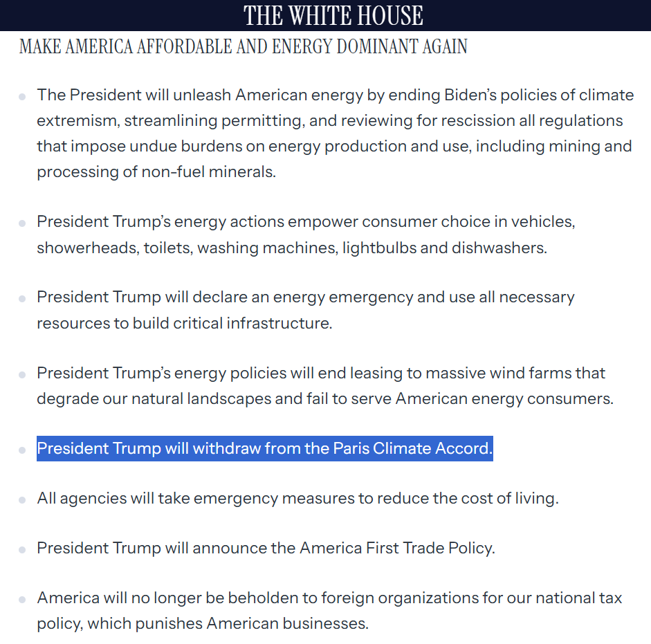 트럼프 대통령은 취임과 동시에 백악관을 통해 트럼프 행정부의 최우선 정책을 발표했다. 그 중에 파리협정 탈퇴에 관한 내용이 있다. 그리고 같은 날 트럼프 대통령은 워싱턴 D.C.의 캐피탈 원 아레나(Capital One Arena)에서 열린 취임 퍼레이드에서 파리협정 탈퇴를 공식화하는 행정명령에 서명했다.