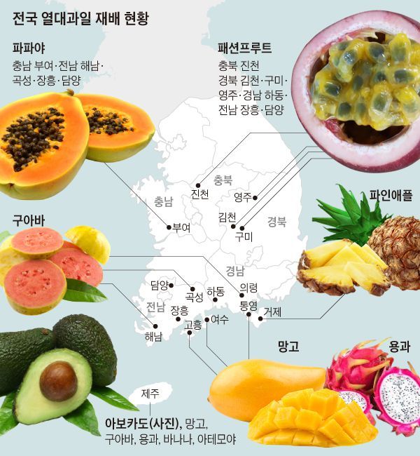 지구온난화에 따라 우리나라에서 재배하는 열대과일은 늘어나고 있습니다. 전국에는 많은 열대과일이 재배되고 있습니다. 파파야는 충남, 전남에 걸쳐 많이 재배되고 있으며, 패션프루트는 충북, 경북, 경남, 전남에 걸쳐 재배되고 있습니다. 그리고 망고를 비롯하여, 구아바, 파인애플, 아보카도, 심지어 용과까지 우리나라 남부지방을 중심으로 재배가 시작됐습니다. 그만큼 남부지방이 따뜻해진 것입니다.