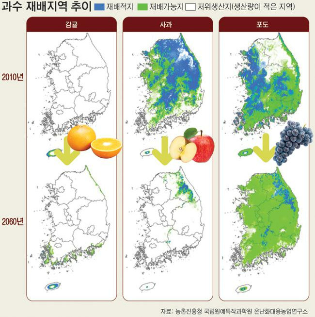 우리에게 익숙한 사과는 2060년 이후에는 강원도 일부 지역에서만 재배가 가능하고, 2100년경에는 국내에서 사과는 더 이상 재배가 불가능합니다. 포도는 현재 경기, 충청, 전북, 경북지역에서 두루 잘 자라는데, 지구온난화로 인해 강원도 지역도 따뜻해짐에 따라 강원도까지 재배지역이 확대됩니다.