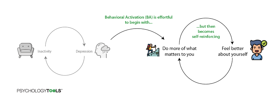 원리는 간단합니다. 활동성이 줄어들게 됨으로써 우울이 더 심해지니 자신에게 의미 있다고 여기는 행동을 하도록 촉진함으로써 악순환을 끊습니다.