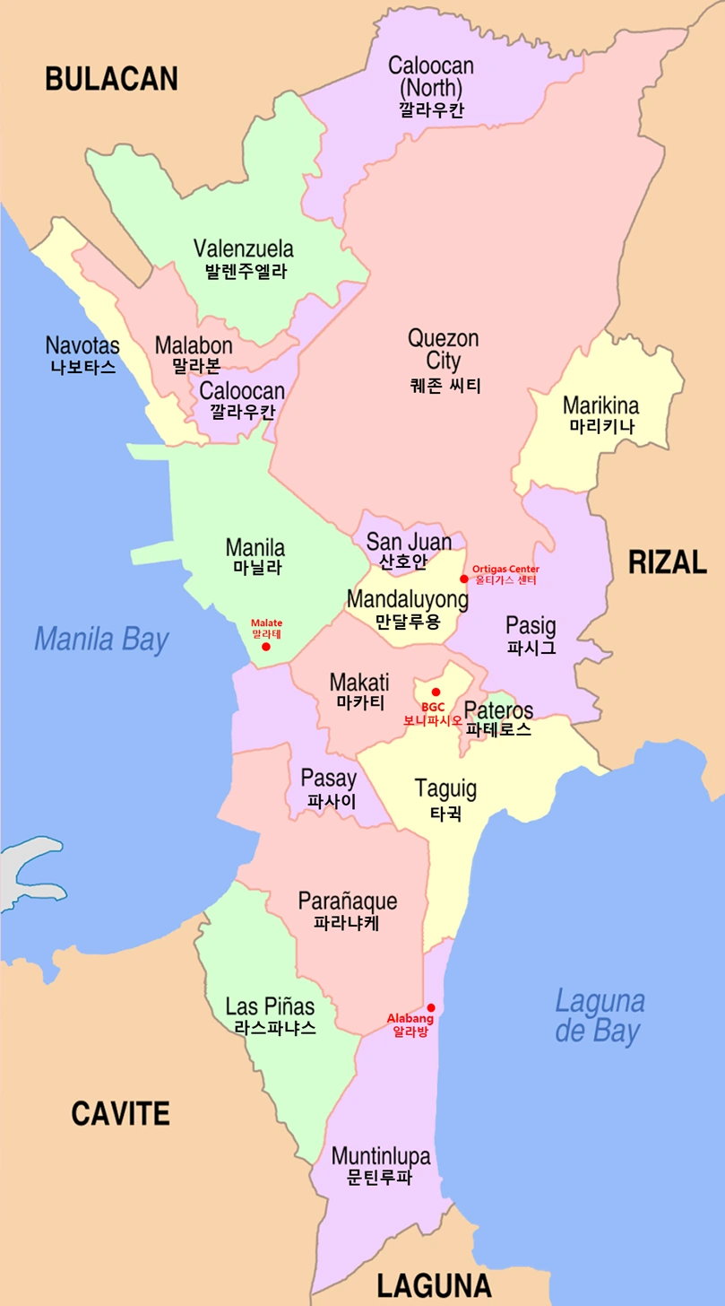 •타귁(Taguig): 라구나데베이 서안에 위치한 도시로 상업시설, 공업시설, 휴양시설이 복합적으로 있는 도시이다.