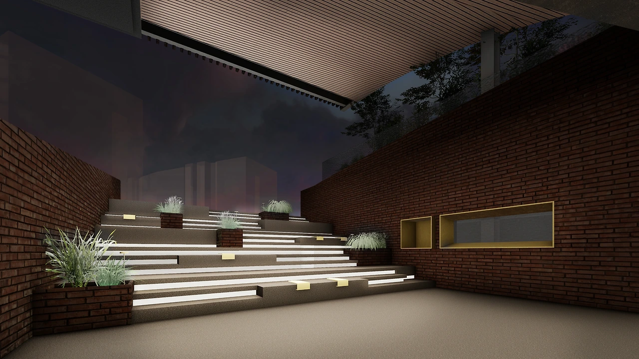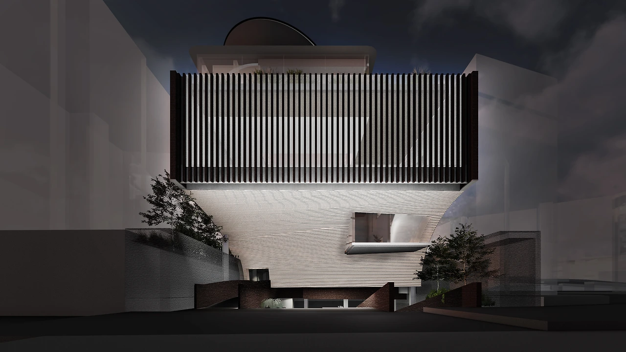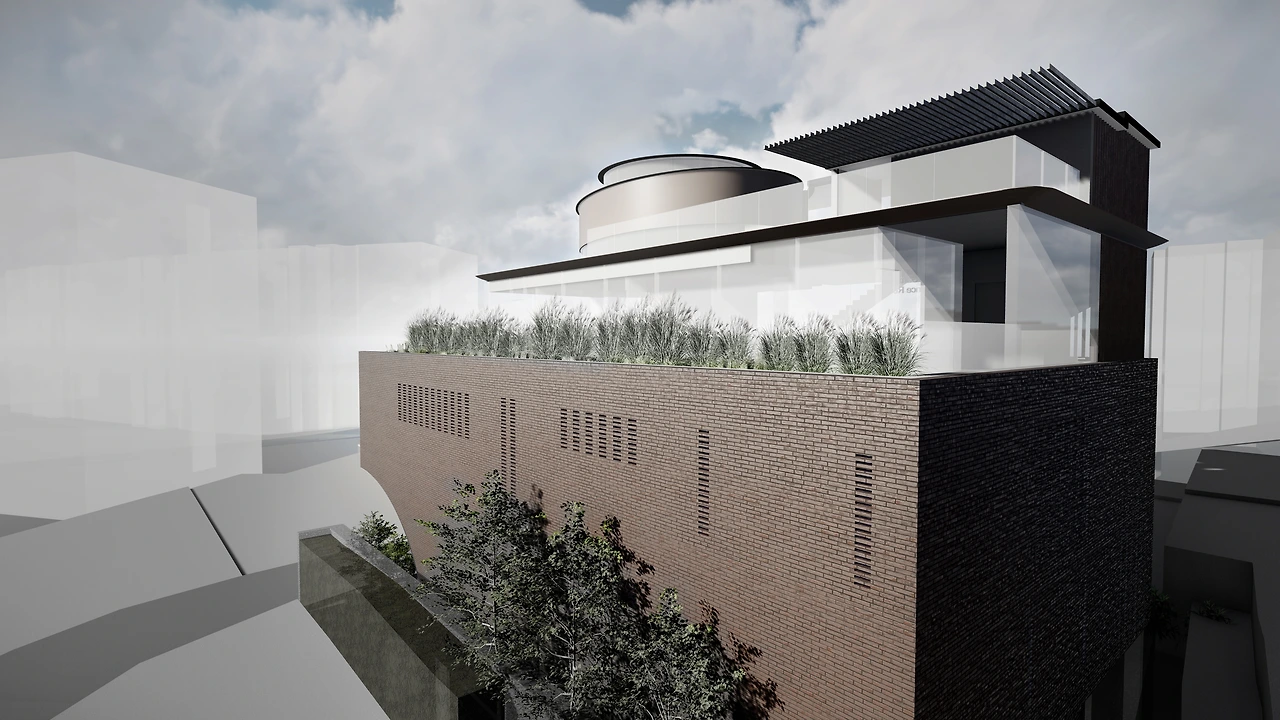 이 공간은 건축법상 일조권 사선 제한을 침해하지 않으면서도 아래의 육면체 매스와는 구분되는 동시에 건물 전체와 예술적으로 어우러져, 힐링 목적에 맞게 독특하게 설계되었다.