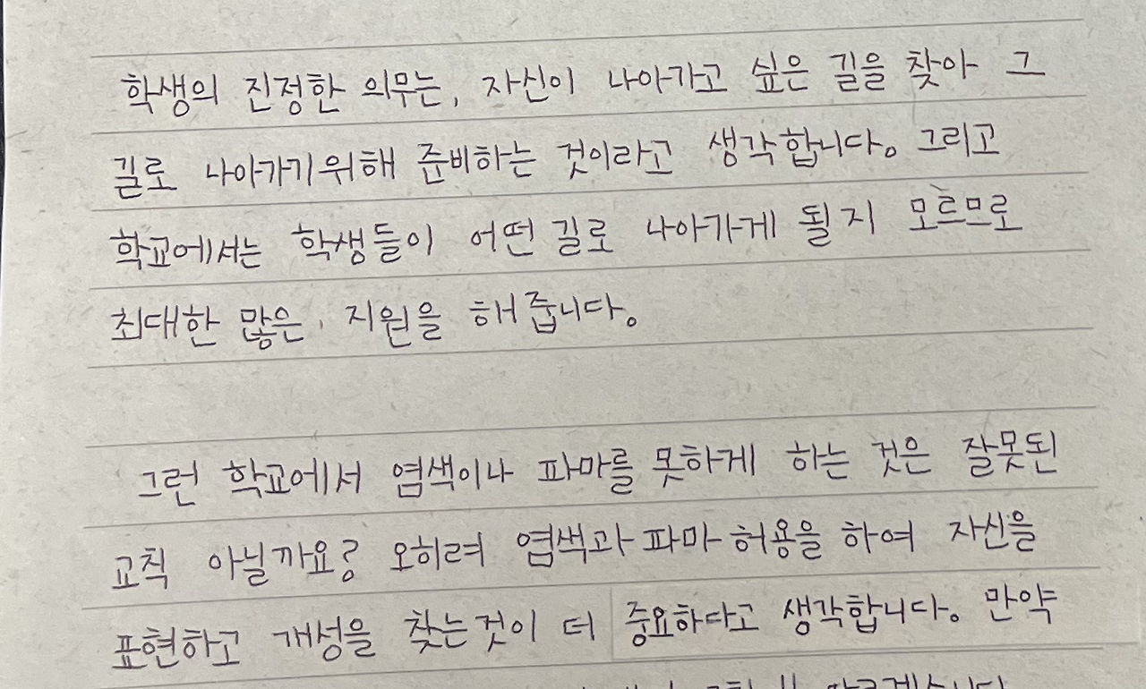 딸아이는 중학교 입학식이 다가올 때부터 교장선생님께 편지를 써야 한다며 목소리를 높였다. 옆 학교는 염색이 허용되는데 왜 자신의 학교는 안되냐며, 부당하다고 목소리를 높였다. 아이의 말을 듣고 어른들은 토론의 장이 열렸다. 염색을 왜 하려고 하느냐는 논제 확인부터 시작하여 이점과 단점을 열거하고 서로 자기주장을 아이에게 관철시키려 노력했다. 나는 아이에게 좀 더 객관적인 데이터를 가지고 편지를 쓰는 것이 좋겠다고 인근 학교의 염색 규정에 대해 알아보라고 했다. 아이는 학교마다 전화를 걸었지만 원칙은 안되고 자세한 건 담임선생님께 물어보라는 뜨뜻미지근한 답변을 받았다.