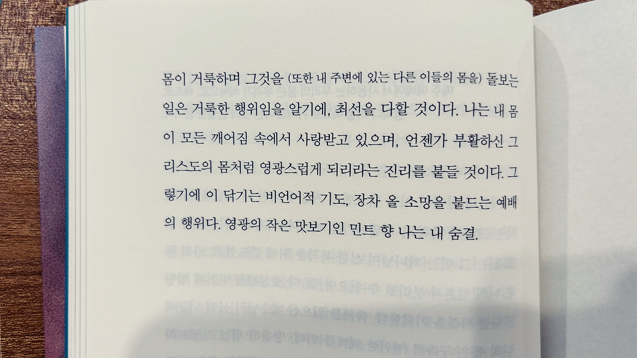 몸을 돌보는 사소한 일과가 어떻게 거룩한 예전(禮典)의 과정이 될 수 있는지를 조목조목 설명해 주는 챕터였다.