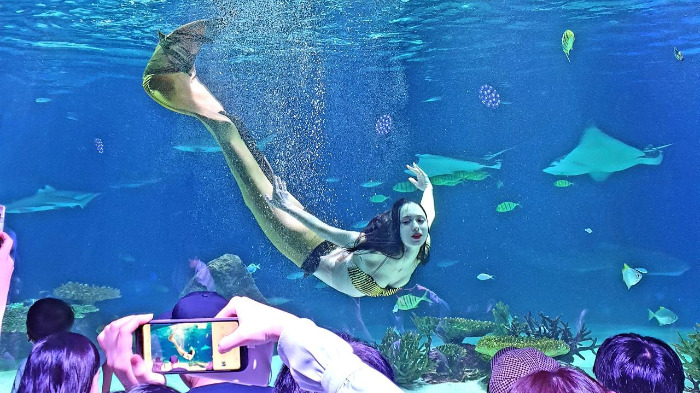 문자가 왔고 바로 바코드로 입장을 하였고 오랜 연륜을 자랑하듯 작고 낮은 천장의 63 아쿠아플라넷은 정상가로 오기에는 민망한 규모와 전시물을 여전히 보여주고 있었지만 인어공주와 신데렐라 퍼포먼스는 모든 관람객들에게 최고의 인기였다.