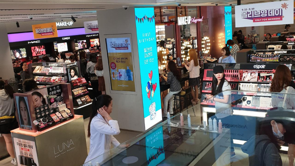 입구부터 매장까지 백화점을 그대로 가져다 놓은 거 같은 느낌이다. 확실히 백화점의 럭셔리한 분위기를 가져다 놓아서 인지 깔끔하고 세련된 분위기였다. 대형 전광판을 통해서 화려함을 주면서도 시선을 모으고 작은 부분들도 신경을 쓴 것으로 보였다. 고가의 수입 브랜드들도 많고 그래서인지 매장 내 고객들의 분위기도 올리브영보다는 나이도 조금 더 있고 패션에 더 신경을 많이 쓰는 사람들로 보였다.
