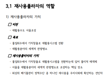 좋은 세상이다 보니 서울 새활용 플라자 기본계획 최종보고서도 검색이 되었는데 당시에는 재사용 플라자였나 보다. 거기 비전은 재활용 수도 서울 조성~ 뭐 비전인데 뭔들 못써^^. 목표에 재활용 시스템 전환도 좋다, 다만 제대로 되고 있는진 모르겠지만 두 번째 목표는 세계적 관광명소였는데 여기서 실소가^^