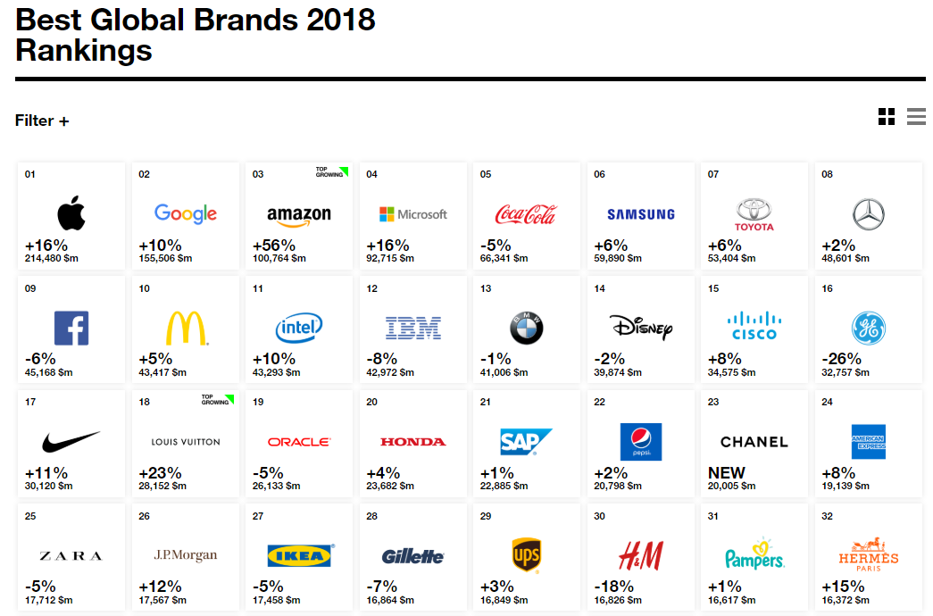 애플과 구글은 16%, 10% 성장으로 1,2위를 지켰고 3위는 전년 5위였던 아마존이 56%의 성장으로 애플과 구글의 아성에 도전하고 있다. 리테일 산업이라는 한계가 있지만 길게 보면 아마존의 상승은 여력이 있어 보인다. 콘텐츠 믹스 시대에 아마존은 고객의 정보와 니즈를 가장 잘 파악하고 있고 솔루션을 잘 제공할 것으로 보이기 때문이다. 코카콜라가 -5%를 기록했는데 앞으로 다른 분야에서 두각을 보여야 할 것으로(그래서 커피 브랜드도 사고 다양한 시도들을 하고 있는데 아직 결실을 맺기엔 일러 보인다) 보이고 페이스북이 -6%인데 페이스북이 아니라 로고북으로 변해서 앞으로 더욱 떨어질 것으로 보인다.