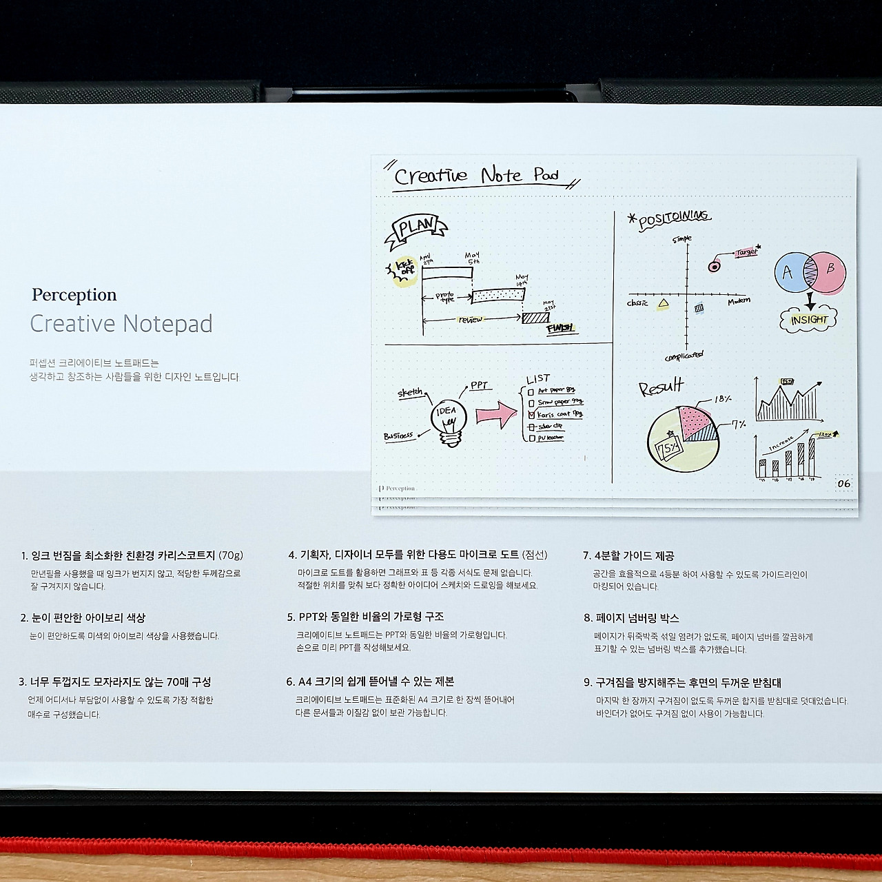 노트 표지에 가로형 노트패드의 장점뿐만 아니라 어떻게 사용할 수 있는지 그림과 함께 친절하게 설명이 되어 있다. 이는 현업의 업무 속에서 도출된 인사이트들이 정리되어 제품에 반영된 것이라는 의미기도 하다. 단순히 노트 만드는 회사의 제조자들의 개념에서 나온 게 아니라 사용자의 업무 행태가 제품으로 만들어져서 사용자의 Needs를 만족시킨다.