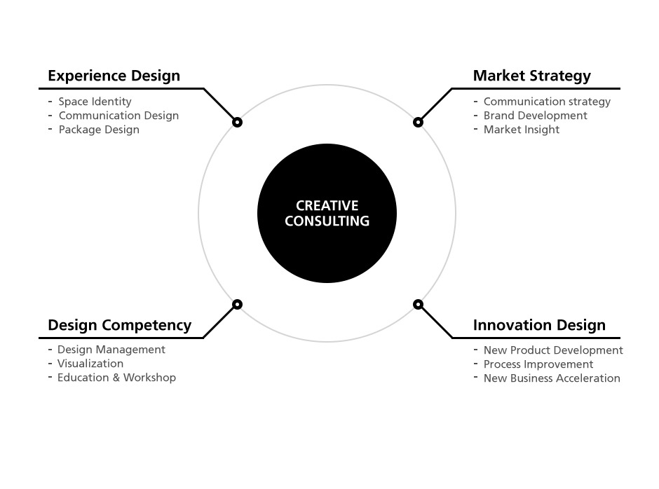 Experience Design, Market Strategy, Design Competency, Innovation Design의 4가지 핵심 업무를 바탕으로 Creative Cunsulting을 하고 있다고 설명하고 있다.