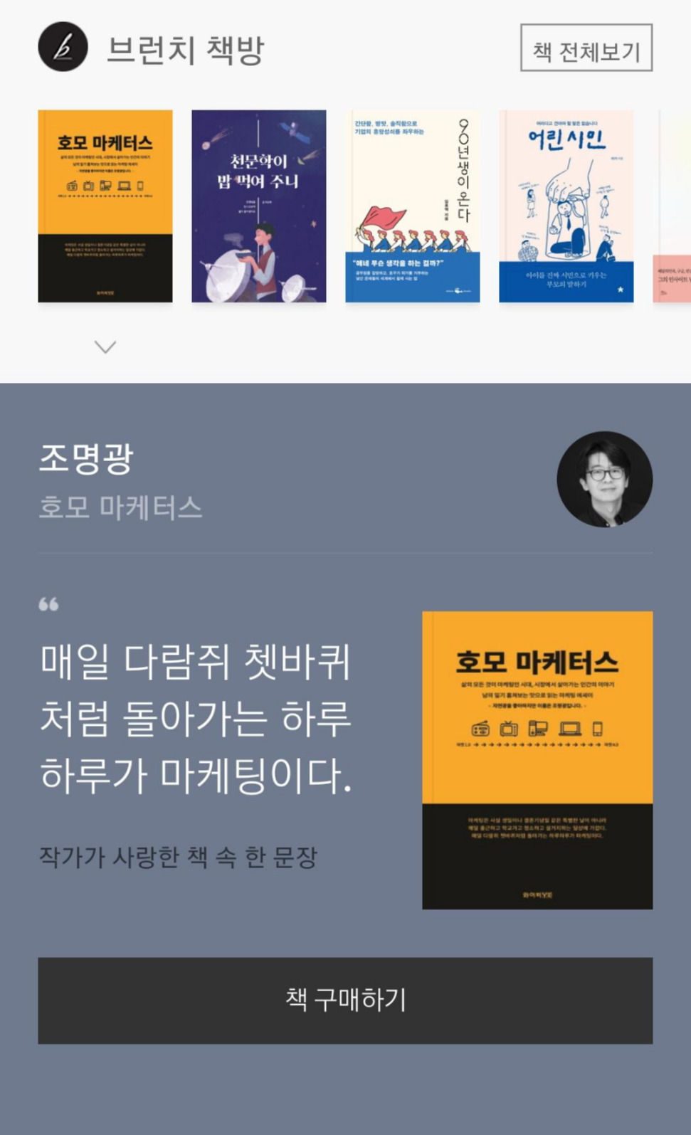 얼마 전 브런치 책방에 책을 등록하지 못한 사연을 라디오에 사연 접수하듯이 브런치에 올렸던 것을 기억하십니까? 드디어 3개월 안에 5개의 글을 올려야 한다는 필수조건을 충족하여(책이 나왔다는 소식과 ebook이 나왔다는 소식과 퍼셉션 크리에이티브 노트패드와 바인더 언박싱 글을 올려서^^) 브런치 책방에 <호모 마케터스> 가 등록이 되었다는 푸시 메시지를 받았고 이렇게 등록된 화면을 캡처할 수 있었습니다.