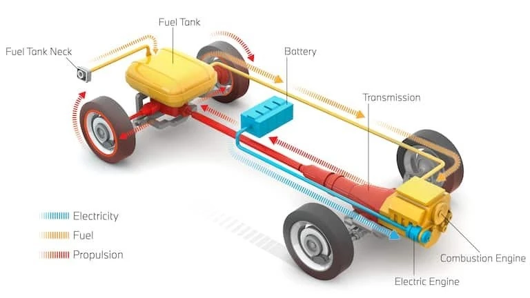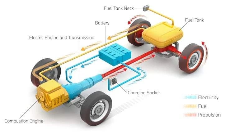 전기 모터와 엔진이 별도로 구동하기도 하고 함께 구동하기도 합니다. 대표적인 차는 요즘 인기 많은 그렌저 하이브리드, 소렌토 하이브리드 이런 것들이 있습니다.