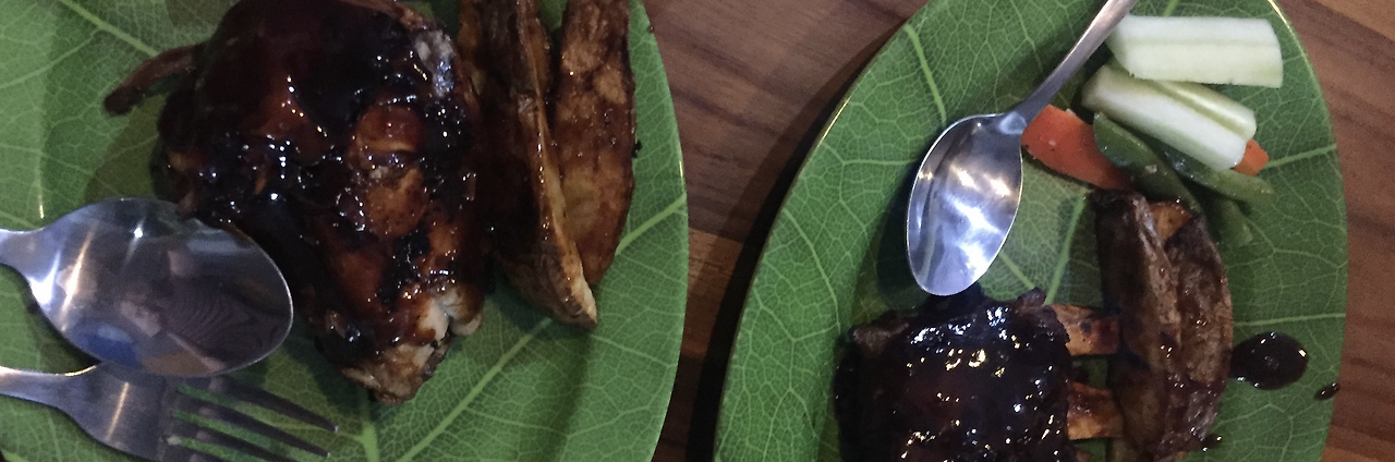 그냥 저곳으로 갈까 생각하며 쳐다보고 있던 중 주인아저씨와 눈이 마주쳤습니다. 아마 그게 싸인이라고 생각했는지 주인아저씨는 차도의 중간을 막아서며 길을 터주었습니다. 바비큐 냄새와 친절한 주인아저씨 콤보를 거절할 수 없어 사테를 포기하고 바비큐를 먹기로 했습니다. 그런 선택을 보상이라도 해주 듯 바비큐는 입에서 살살 녹았습니다. 이렇게 저렴한 가격에 입에서 살살 녹는 바비큐를 먹을 수 있는 것에 감사하며 계속 주문을 했습니다. 아주 유명한 식당은 아니었지만 바로 앞에서 구워주는 맛있는 바비큐 냄새에 뭔가에 홀린 듯 고기 한 번 쳐다보고 구워주는 아저씨 한 번 쳐다보며 기다리니 또 금방 맛있는 고기가 접시에 담겼습니다. 발리에서는 접시를 초록색이나 나뭇잎 모양을 많이 쓰는 것 같은데, 아마 바나나 잎을 접시로 이용했기 때문이 아닌가 합니다. 마지막 만찬은 말 그대로 정말 만찬이 되었습니다. 다시 여기에서 바비큐를 먹지 못한 것을 후회할 정도입니다.