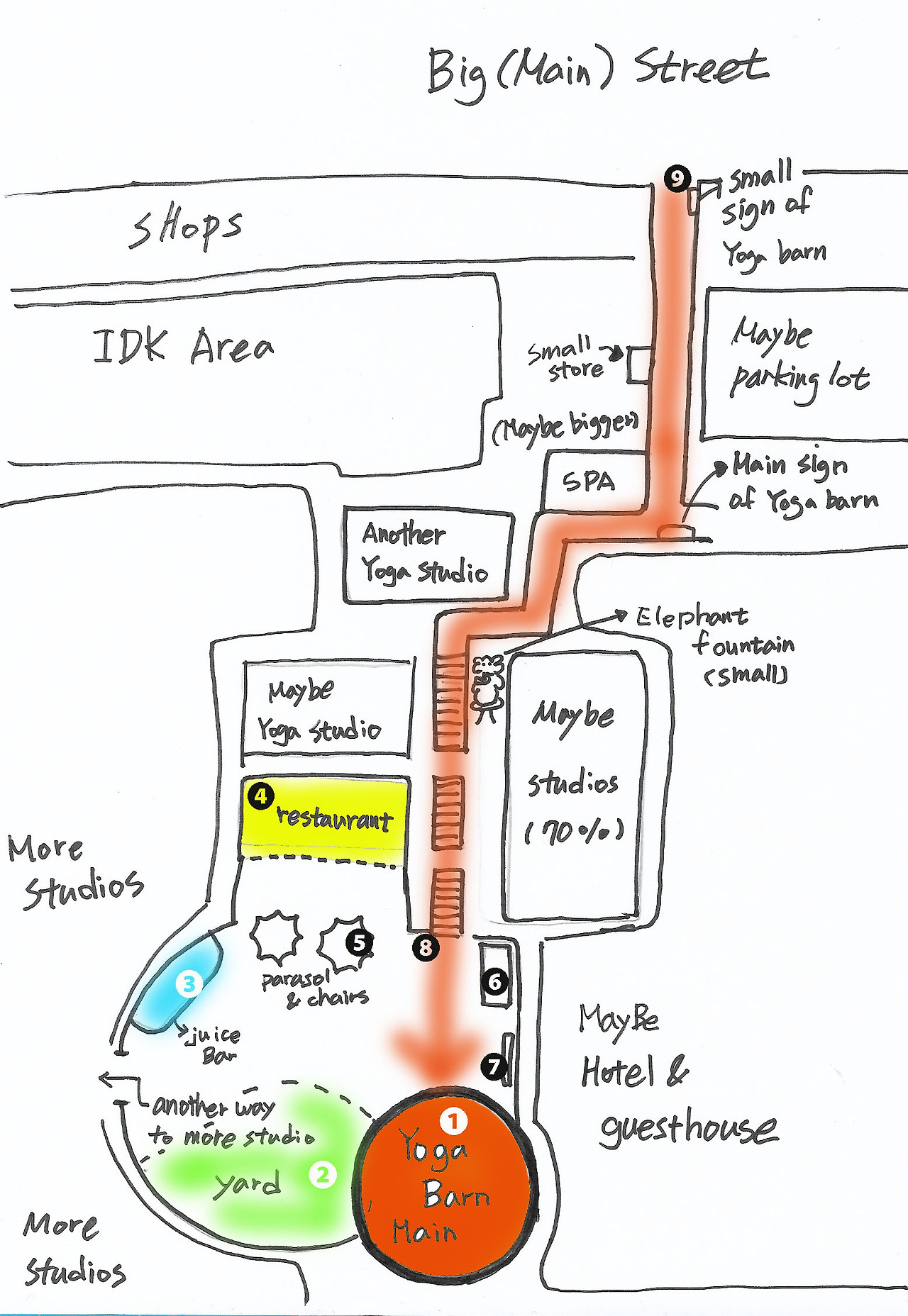 제 경험과 기억을 바탕으로 지도를 한 번 그려보았습니다. (직접 보지 못한 곳은 추정하여 그렸습니다. 굉장히 주관적인 경험에 따른 지도이기 때문에 참고만 해주세요.) 요가반은 메인 거리에서 꽤 들어와야합니다. 저도 처음에 들어가면 긴가민가 했습니다.