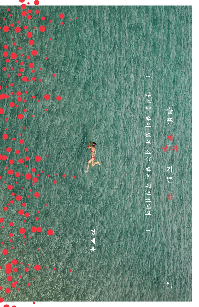 그러니 푸른 물결 위에서 빨간 비키니를 입고 수영을 하고 있는 저 사진에 홀리듯 이끌려(물론 정혜윤 작가의 신작이라는 걸 미리 알고 검색한 거지만) 책을 주문한 건 당연한 일이었다. 책이 도착하고 한참을 표지 사진을 바라본다. 내 속이 뻥- 뚫리는 기분. 당장이라도 물에 풍덩 뛰어들어 팔다리를 문어처럼 움직이고 싶은 마음이 든다. 왠지 이 책 속에 나를 위해 준비한 선물이 들어있을 것 같은 기대감까지. <슬픈 세상의 기쁜 말>이라는 제목 탓이겠다.