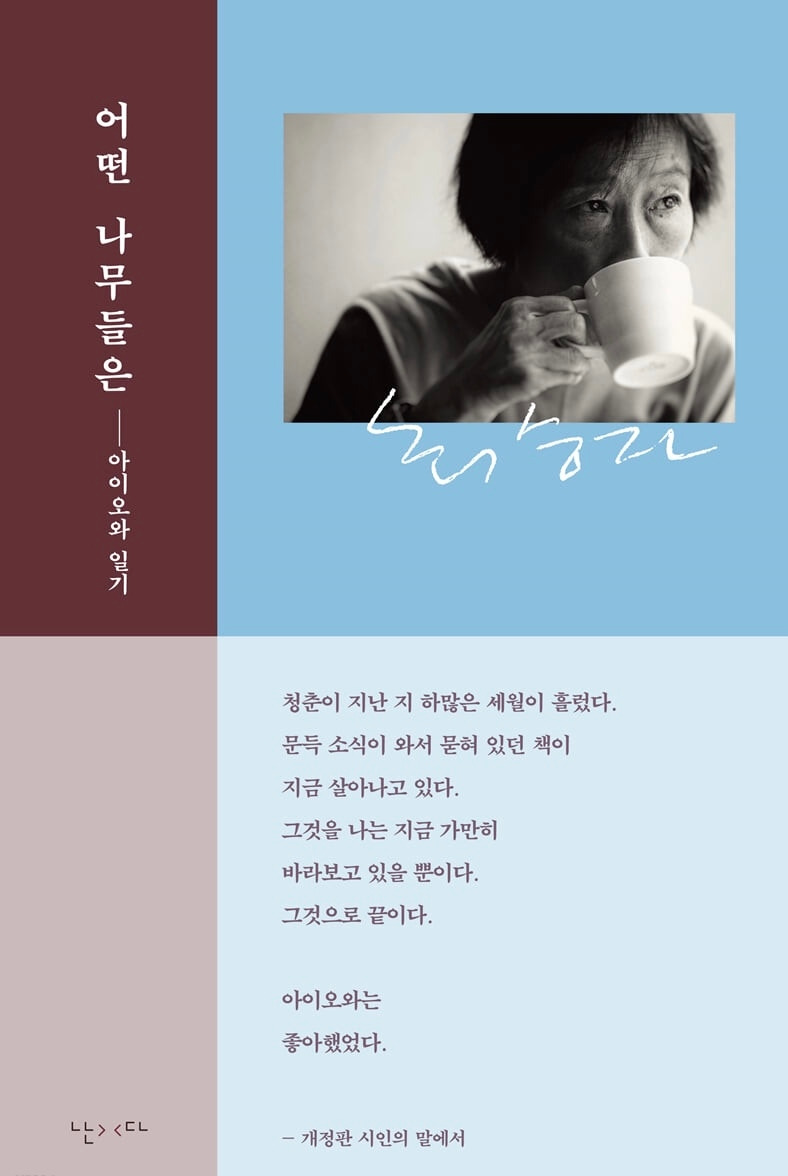 그런데 나, 이 책이 좋다. 그냥 좋다. 이미 여러 번 읽어서 굳이 다시 펼쳐 읽지 않을 법한데도 가까이 두고 아무데나 펼쳐서 읽는다. 책상을 정리하면서 다 본 책들을 책꽂이에 꽂아두느라 이 책 역시 책꽂이에 꽂아 둔 적이 있는데, 다음 날 아침에 노트북 앞에 앉아서 뭔가를 계속 찾다가 그게 이 책이었다는 걸 깨닫고 이제는 치우지 않는다. 그냥 옆에 둔다. 새삼스러운 마음으로 책의 표지를 본다. '어떤 나무들은'이라고 적인 흰 글씨도 좋고, 뭔가를 마시느라 컵을 들고 있는 최승자 시인의 얼굴도 좋고, 부연 하늘색과 나무를 닮은 갈색의 세련된 조화도 좋다. 표지를 한 장 넘기면 날짜만 빼곡히 적힌 목차도 좋고,