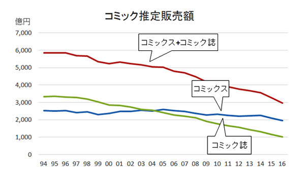 비교도 안 될 정도로 1990년대에 치우쳐 있다. 가장 많이 상승한 시기는 1980년대로 이때 출판만화 붐이 시작해서 90년도에 정점을 찍었다. 그 이후로는 아주 빠르게 쇠퇴하는 모습을 보여주고 있다. 2010년대 합산의 경우 1950년대보다 조금 나은 수준이다. 물론 이 숫자는 단행본만 집계한 내역 같아서 이북 시장까지 고려하면 상황이 또 다를 것이다.
