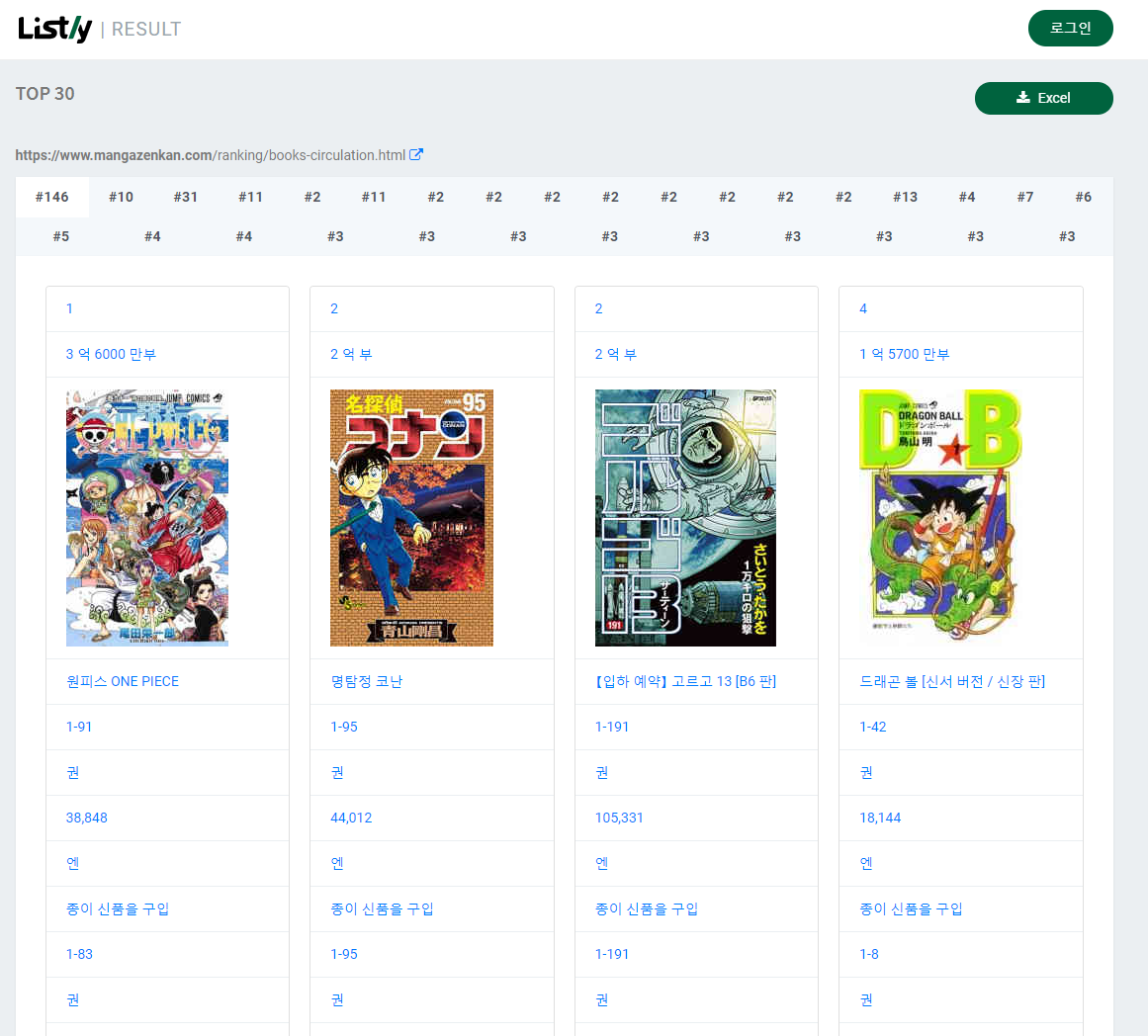 데이터는 여기서 얻었다. 만화전권닷컴이라고 되어 있는데, 내가 데이터를 모을 당시는 2018년 12월 초중반이라 지금과 데이터가 약간 상이하게 나온다. 크롤링을 할까 했지만 1페이지밖에 안 되는데 뭣하러 크롤링하나 싶어서 Listly 크롬 익스텐션으로 긁었다. 처음에는 크롬 번역으로 띄워놓고 긁었더니 제대로 안 되어서 원어로 띄워놓으니 한 방에 해결.