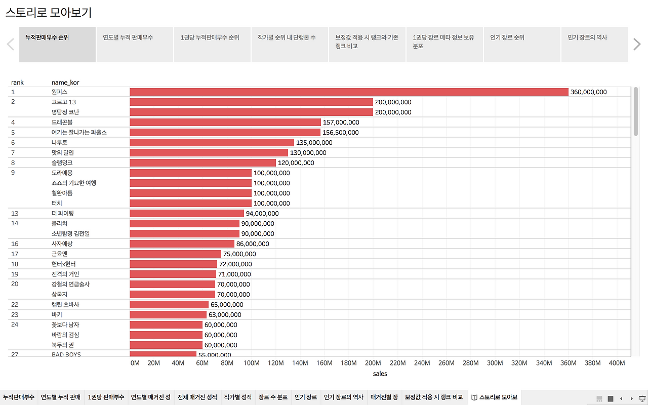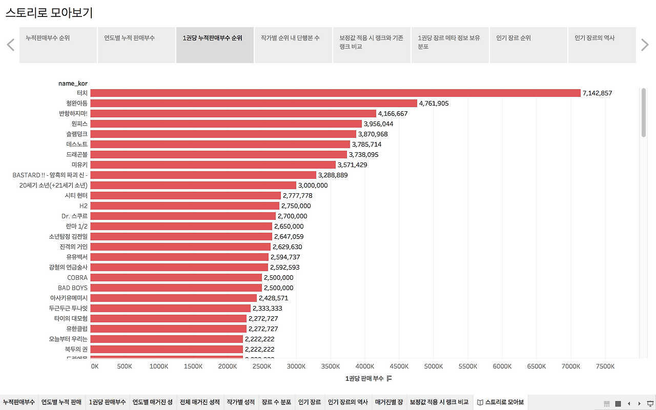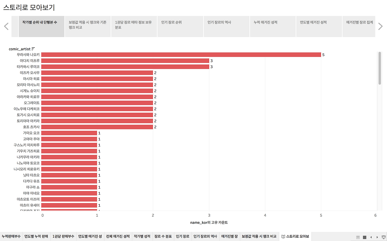 만화전권닷컴에 없는 데이터는 전부 내가 위키 같은 곳에서 긁어온 거라 정확하지 않을 수 있다. 데이터를 모은 후에는 Tableau로 시각화해보았다. 그냥 빠르게 데이터 형태를 보고 싶으면 Tableau가 편하다고 생각한다. 엑셀처럼 피봇해야 할 필요도 없고 코딩할 필요도 없다..