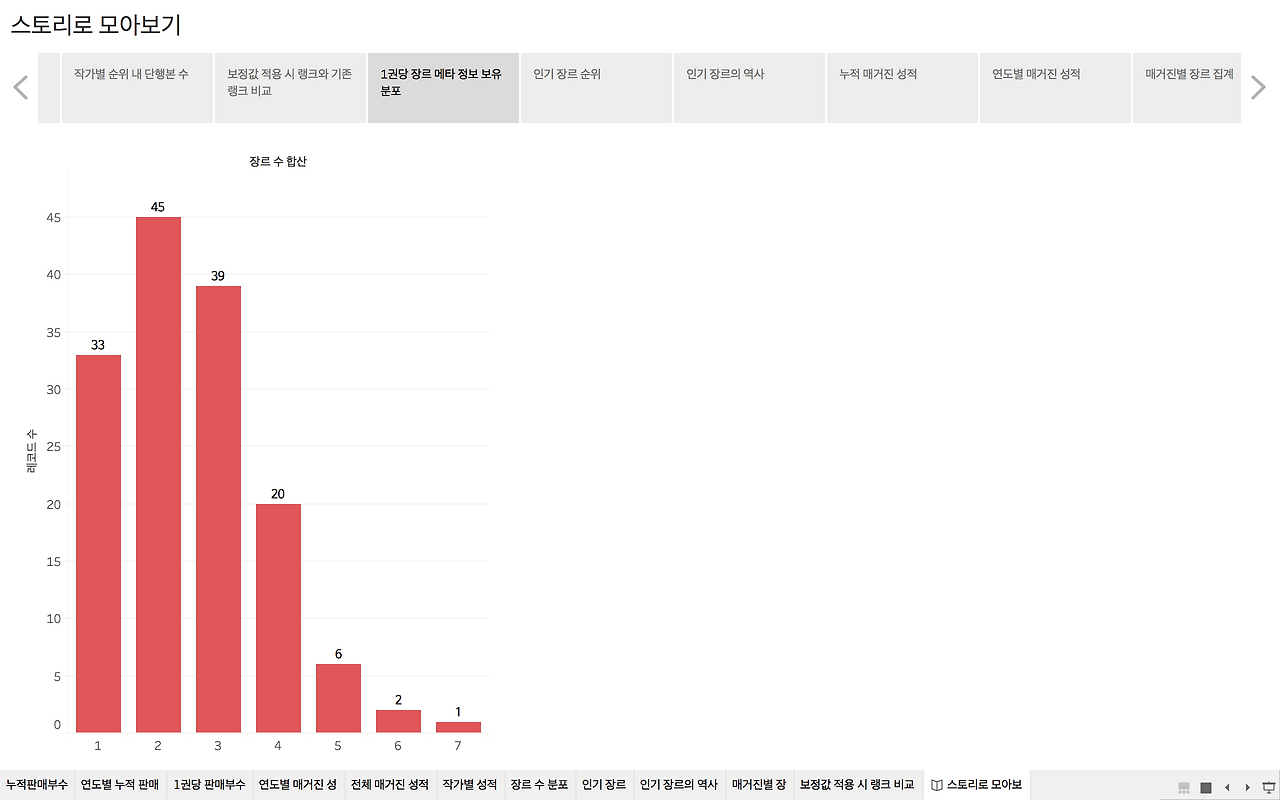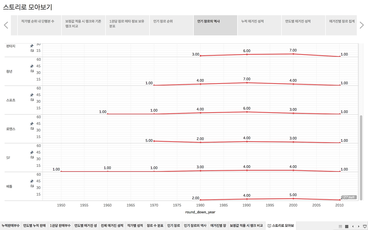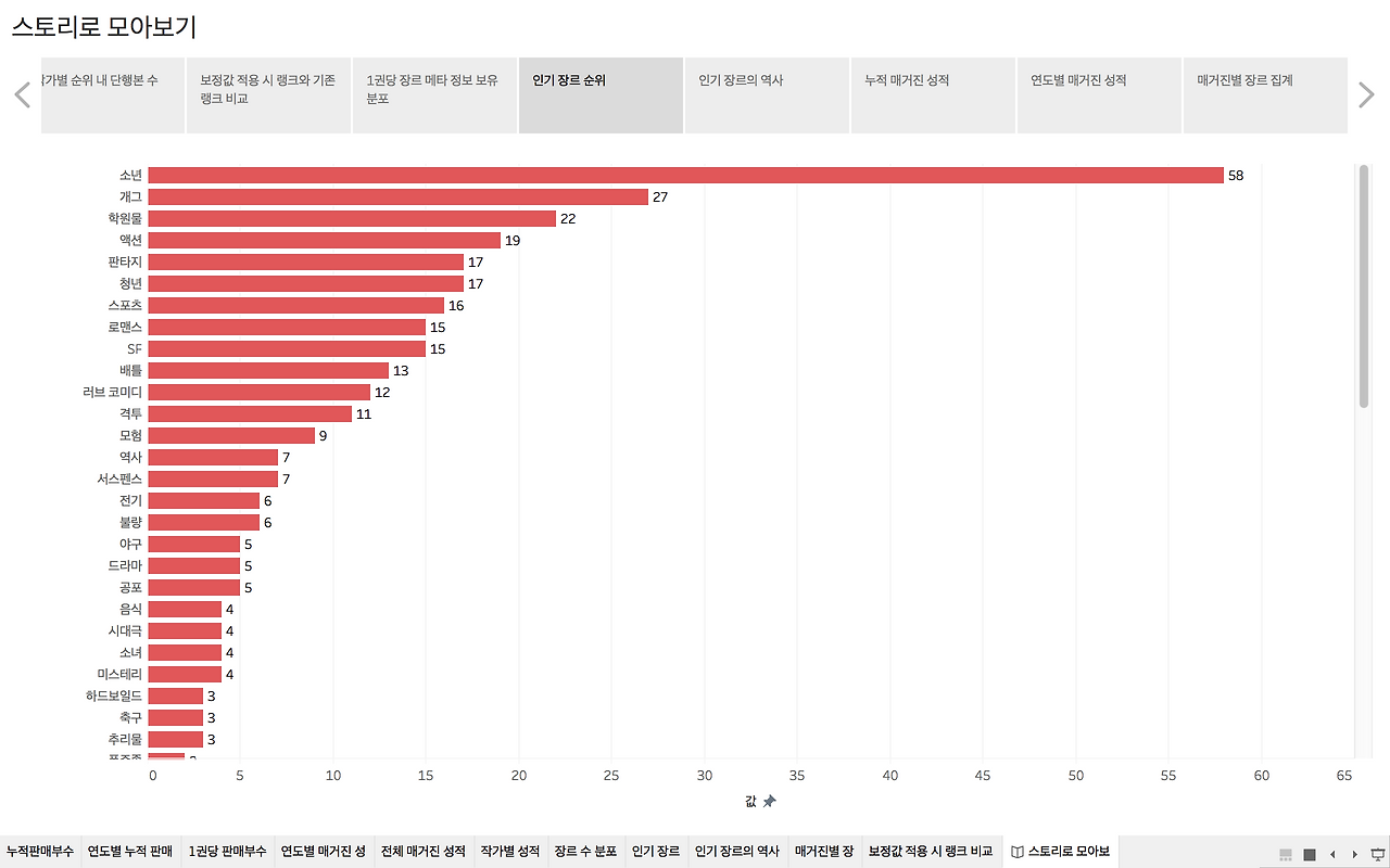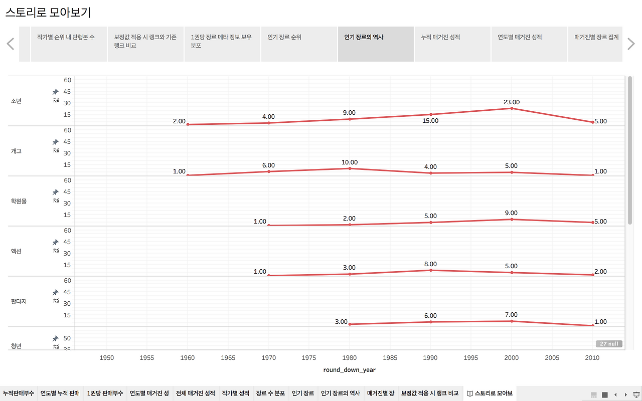 만화전권닷컴에 없는 데이터는 전부 내가 위키 같은 곳에서 긁어온 거라 정확하지 않을 수 있다. 데이터를 모은 후에는 Tableau로 시각화해보았다. 그냥 빠르게 데이터 형태를 보고 싶으면 Tableau가 편하다고 생각한다. 엑셀처럼 피봇해야 할 필요도 없고 코딩할 필요도 없다..