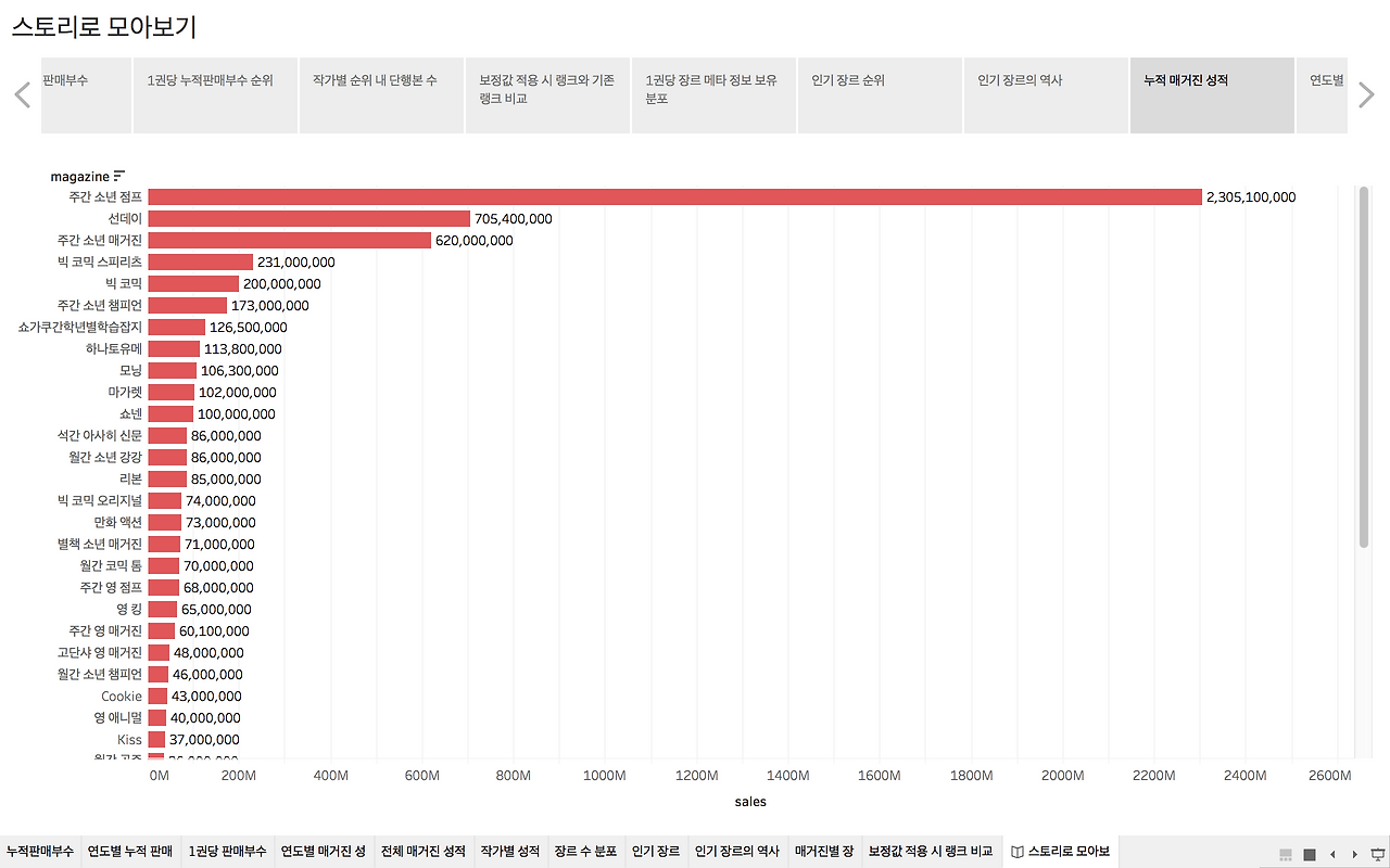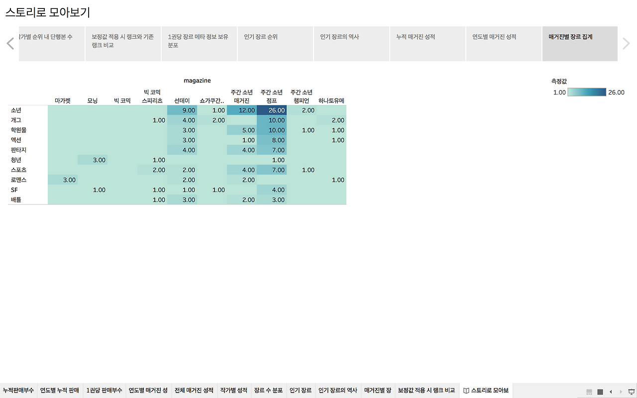 나는 이 데이터를 1. 발행 부수, 2. 장르, 3. 매거진 이 세 개의 초점으로 나누어서 살펴보았다.