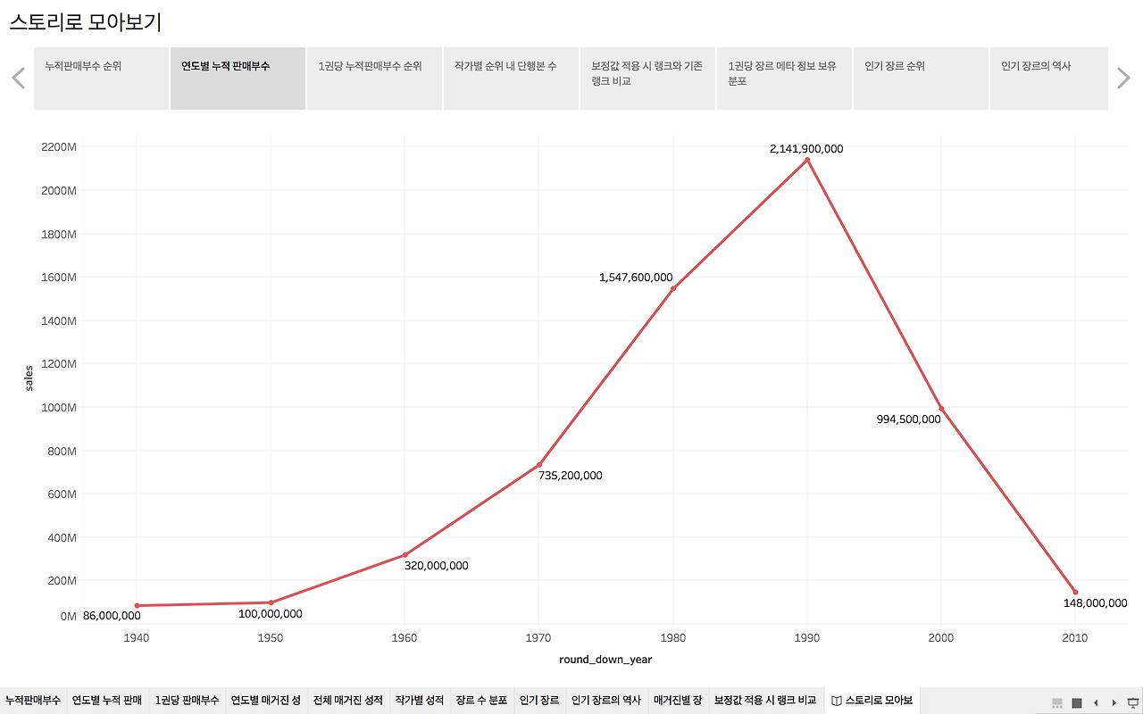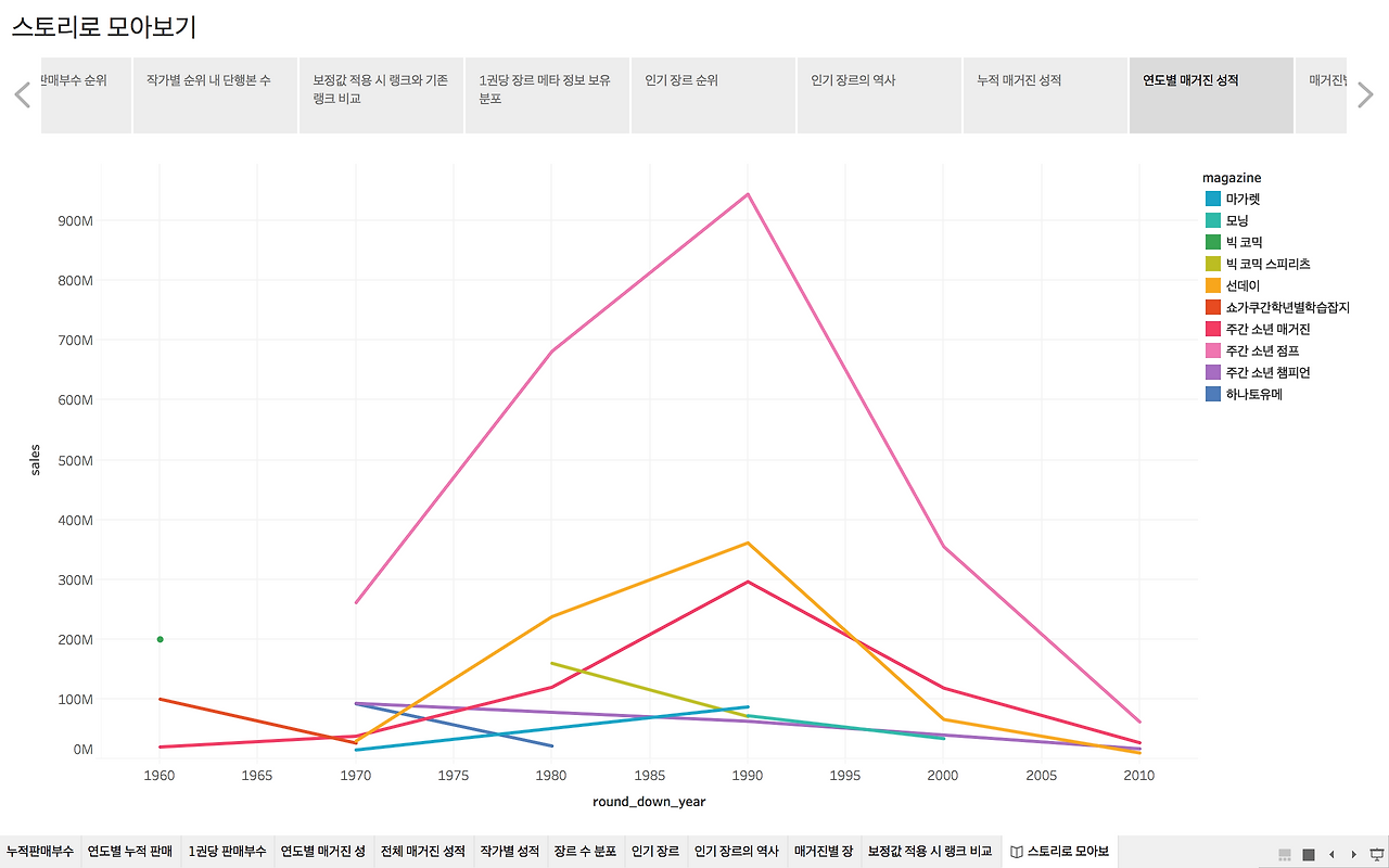 이렇게 대략적으로 재미 삼아 일본 출판만화 역대 발행 부수 데이터를 살펴봤다. 출판만화의 흥망성쇠와 작가의 세일즈력, 매거진 비중을 실제로 확인해보니 꽤 재미있었다. 이게 정말 별 거 아니라 슥 긁기만 해서 Tableau 올리고 돌리기만 한 거라 쓸까 말까 했는데 적어도 나는 재밌있어서 만족! 개운하다.