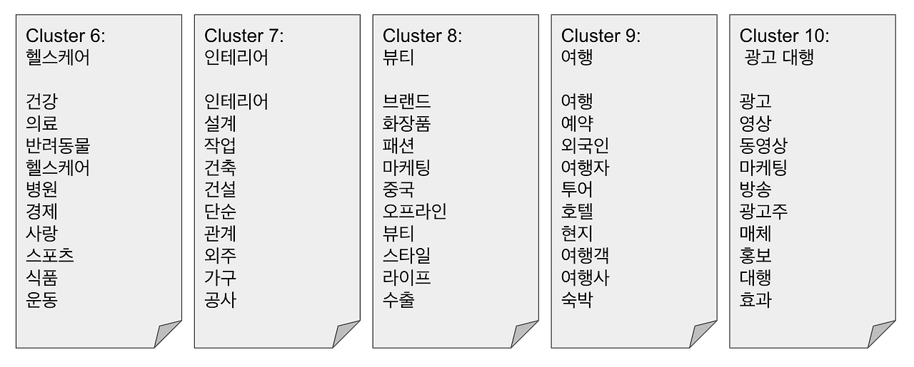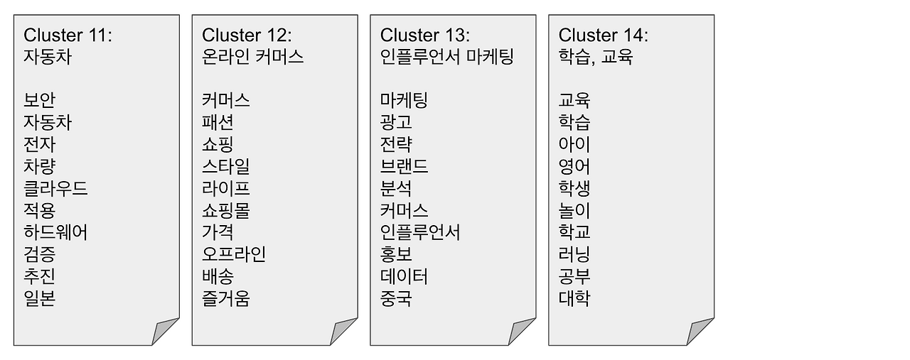 그래서 다음과 같이 14개의 분류가 나왔다. 클러스터 번호 아래의 제목은 클러스터 별로 포함된 단어 묶음을 보고 내가 이름을 붙인 것이다.