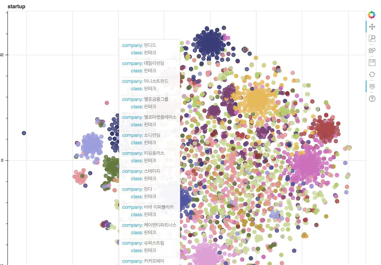 문서단위의 시각화는 t-sne로 차원을 축소하여 bokeh로 plot을 생성하였다. 각 점이 기업을 뜻하고 색깔이 같으면 같은 분류에 속하는 것이다. 마우스를 올리면 어떤 기업이 어떤 분류에 속하는지 확인할 수 있다. 직접 확인해보고 싶은 분을 여기에 파일을 올려두었다.