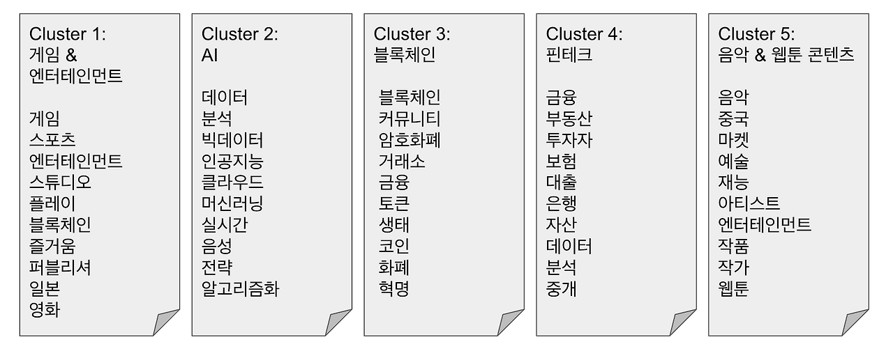 의도하는 바는 학습 데이터를 주지 않고 알아서 묶어보게 하는 것이었다. 그리고 데이터를 어떻게 수집할지 찾았다. 각 스타트업이 어느 업종인지 확인할 수 있는 데이터란 뭘까 생각하다가 설명자료가 있다면 그걸 쓰면 되겠다고 생각했다.