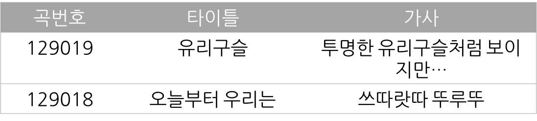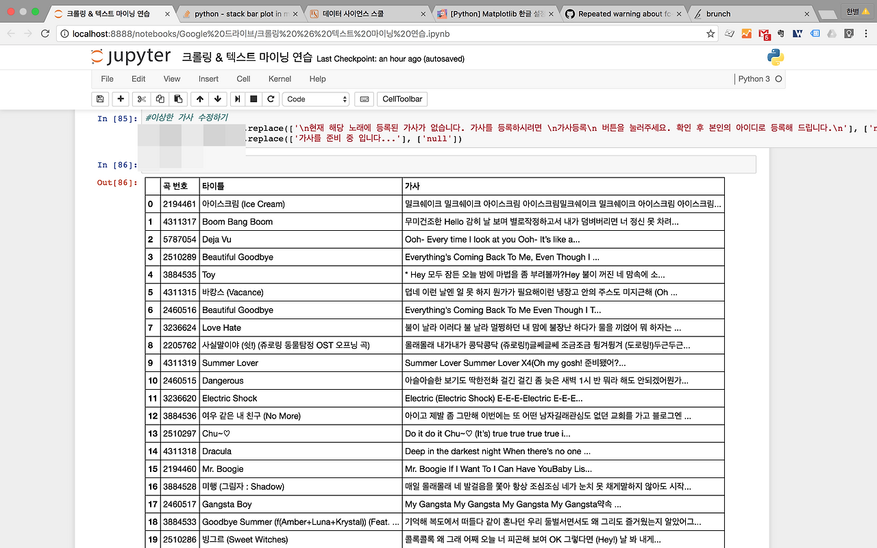 네이버 뮤직은 각 아티스트마다 아티스트 번호가 부여되어 페이지가 구분된다. 가사의 url이 곡번호가 바뀌는 형식이어서 곡번호를 크롤링 하고, 또 다시 아티스트 번호를 바꿔 곡 번호를 크롤링한 후, 그 곡번호가 무엇을 의미하는지 말해줄 타이틀, 분석의 주 재료인 가사를 크롤링했다. 가사가 등록되지 않은 MR의 경우는 크롤링 이후에 'null' 값으로 대체하였다.