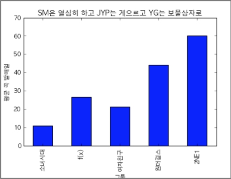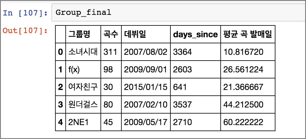 걸그룹은 숙고한 끝에 소녀시대, 원더걸스, 2NE1, f(x), 여자친구 총 다섯 그룹을 선택하였다. 대중적이면서도 그룹별 색깔이 강하다고 생각되는 결정하였다. 참고로 나는 python도 jump to python 하나만 설렁설렁 봤고, pandas나 matplot은 tutorial 위주로 보고 하여간 다 설렁설렁 봤다. 빡시게 하겠다는 생각이 없었기 때문에 에러가 나면 아예 멈추고 놀기도 하다보니 전체적으로 시간이 많이 걸렸다. 실제적으로 들인 시간은 길지 않다.