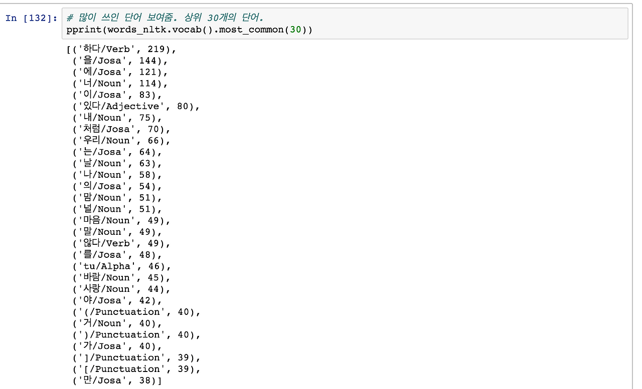 다른 그룹들과 비교했을 때, 여자친구는 명사의 비중이 높았고 소녀시대나 f(x)는 구두점(하이픈이라든가 물음표 등)의 비중이 높으며 원더걸스와 2NE1은 영어의 비중이 높았다. SM 소속사의 가사가 일본인 작사가가 많아서 그런 건지 일본의 영향을 받아서 그런 건지 구두점이 많은 것 같다. 원더걸스는 미국 진출(..)을 꿈꾸며 만든 영어 노래가 있어서 영어의 비중이 높게 나오는 것 같고, 2NE1은 대표곡인 Fire나 I'm so lonely만 봐도 영어 후렴구가 반복되어서 영어의 비중이 높게 나오는 듯 하다. 이것으로 가설1-1을 확인했고 한 단계 더 나아가서 많이 사용하고 있는 단어의 랭크를 30위까지 뽑아 확인해보기로 했다.