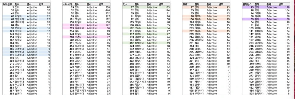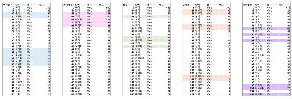 그리고 좀 재밌다고 생각했던 부분이 f(x)의 동사 상위 순위에서는 '알다', '모르다'가 있었던 것이다. '모르다'의 경우는 그래도 순위가 좀 낮더라도 다른 그룹에서도 나타나는데 '알다' 같은 동사는 거의 있는 그룹이 없다. 내 생각엔 f(x)가 데뷔 당시 미성년자가 성인이 되어가는 미성년자가 많은, 그래서 사랑이라는 감정을 몰랐다가 알아가는 느낌의 가사가 꽤 있어서 이런 결과가 나왔을 것 같은데 확실히는 모르겠다.