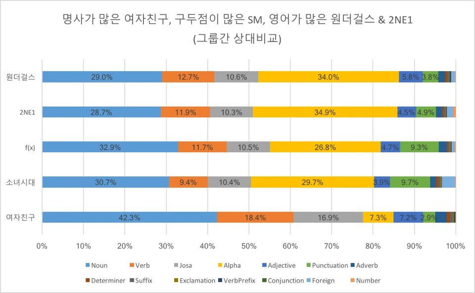 가설1-1. 걸그룹마다 많이 사용하는 품사군이 다를 것이다.