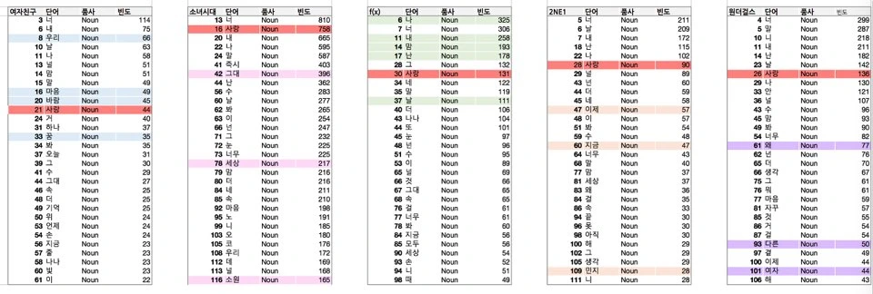 먼저 명사의 경우 모든 그룹에서 공통적으로 상위 랭크에 사랑이 있었다. 가사의 공통 주제가 사랑에 관한 것이어서 그런 듯 싶다. 다음으로는 일반적으로 많이 사용되는 명사를 제외하고 다른 그룹에 비해 랭크가 높은 단어들을 골라 색칠해보았다. 여자친구(하늘색)는 '우리'에 대해서 이야기 하고 있고 '마음'과 '바람', '꿈'에 대해서 전체적으로 희망차고 소녀적인 느낌을 준다. 소녀시대(분홍색)의 경우 '너'라는 2인칭 대명사 외에도 '그대'라는 대명사를 많이 사용하고 있으며 '세상과 '소원'에 대해서 이야기 하고 있다. f(x)(초록색)는 다른 그룹보다도 '나'('날' '내' 등 변용 포함)의 언급이 많아 자기 감정 표현이 가사에 더 많지 않을까 싶다. 2NE1(주황색)에서 비교적 상위 랭크를 차지하는 '이제', '지금' 등 시간을 나타내는 단어들은 과거와 현재를 비교하는 가사에서 온 것 같다. 원더걸스(보라색)에서 색칠한 '왜', '다른', '여자'는 박진영의 가사가 날 버리고 다른 여자에게로 간 남자에 대한 류여서 그런 것 같다. 이제 동사도 살펴봐야지.
