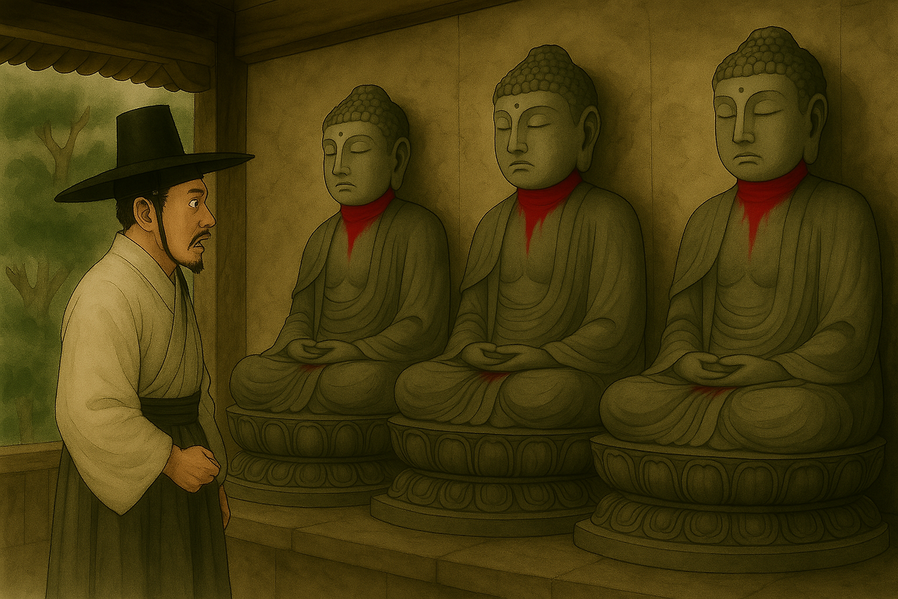 “저희도 알 수 없는 일입니다. 지난 3일 미시(未時:오후 3시)에 부처님을 이곳으로 모셨는데, 이상스레 칼 소리가 나기에 쳐다보니 이 부처님의 목에 칼자국이 생겨 나면서 피가 흘렀습니다.”