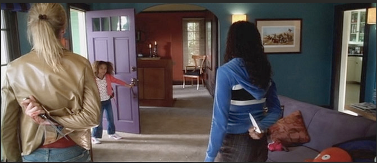 자신의 결혼식을 피투성이로 만들었던 멤버 중 한 명인 ‘버니타 그린’을 찾아온 키도(우마 서먼)가 화면에 등장한다. 복수의 대상인 멤버는 킬러 생활을 청산하고 여느 중산층 학부모와 다를 바 없는 평범한 삶을 살고 있고 키도가 문을 두드리자 환한 미소와 함께 나온다. 문을 열면 예의 그 삐뽀삐뽀 음악이 나오는데. 심각한 순간에 삐뽀라는 표현이 미안하지만 직접 들어보면 삐~뽀 외에는 답이 없을 것이다. 이 음악은 이후 키도의 뚜껑 열림을 상징하는 표식으로 사용된다. 키도와 붙을 때 이 음악이 나오면 그냥 그 상대는 골로 간다 생각하면 된다. 암튼 문이 열리고, 서로를 알아본 둘은 거두절미하고 본론으로 들어가 엄청 절도 있고 박력 있게 싸우면서 집안을 다 때려 부신다. 두 사람은 긴바지를 입고 있지만, 근육으로 가득 찬 허벅지는 근사하게 꿈틀거린다. 유리 테이블이 박살 날 정도로 메다 꽂히고 나무 방망이로 허벅지를 맞아도 징징대지 않고 싸워 나가는 그녀들의 모습은 뜨겁고 냉정하다. 그러다 정확히 러닝 타임 7분 5초에 넘어진 탁자를 두발 뛰기로 가볍게 넘는 키도의 뒷모습이 나오는데 평소 ‘간지란 무엇인가’라는 질문의 답을 찾고 있었던 내게는 깨달음의 순간이기도 했다.