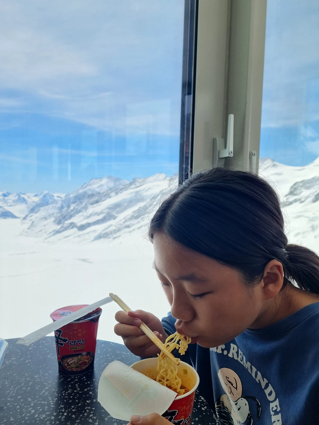 (융프라우산에 올라가는 곤돌라 안) 달력사진이 연속촬영 되는 느낌이다. (산 정상)노르웨이에서 처음 마주치고 깨달았다. 투명한 푸른 속살이 좋다. 난 빙하애자다./ 공짜 컵라면 때문에 다시 오고 싶다는 귀순ㅋㅋ(라면 무료쿠폰님! 감사합니다.)